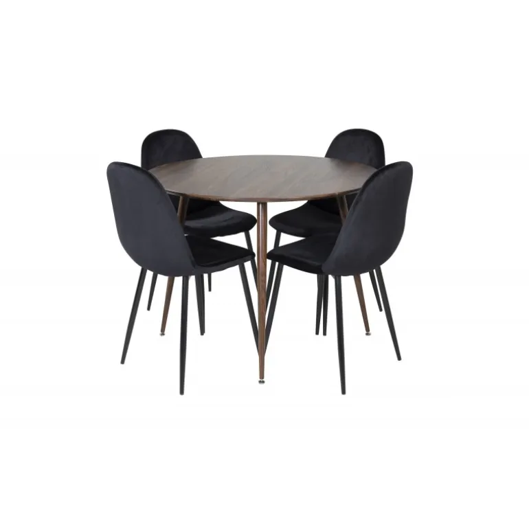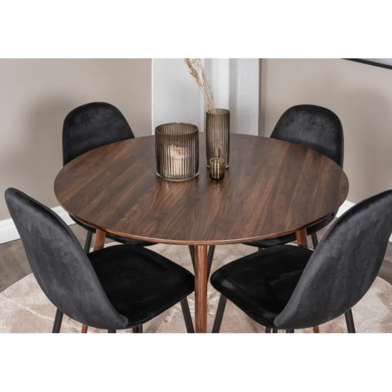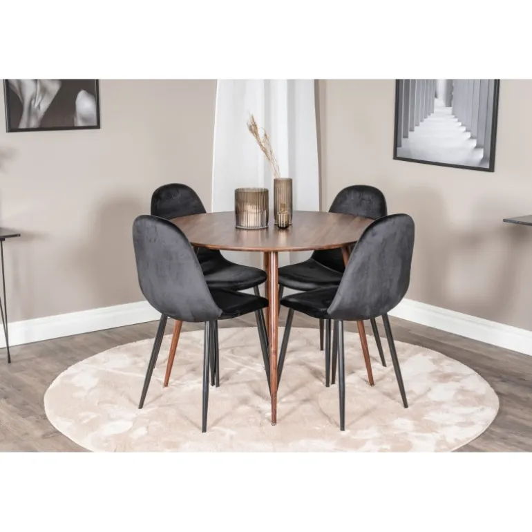 - Elegant Design: Kombinerer et rundt bord i valnød og sorte stole for et klassisk look.