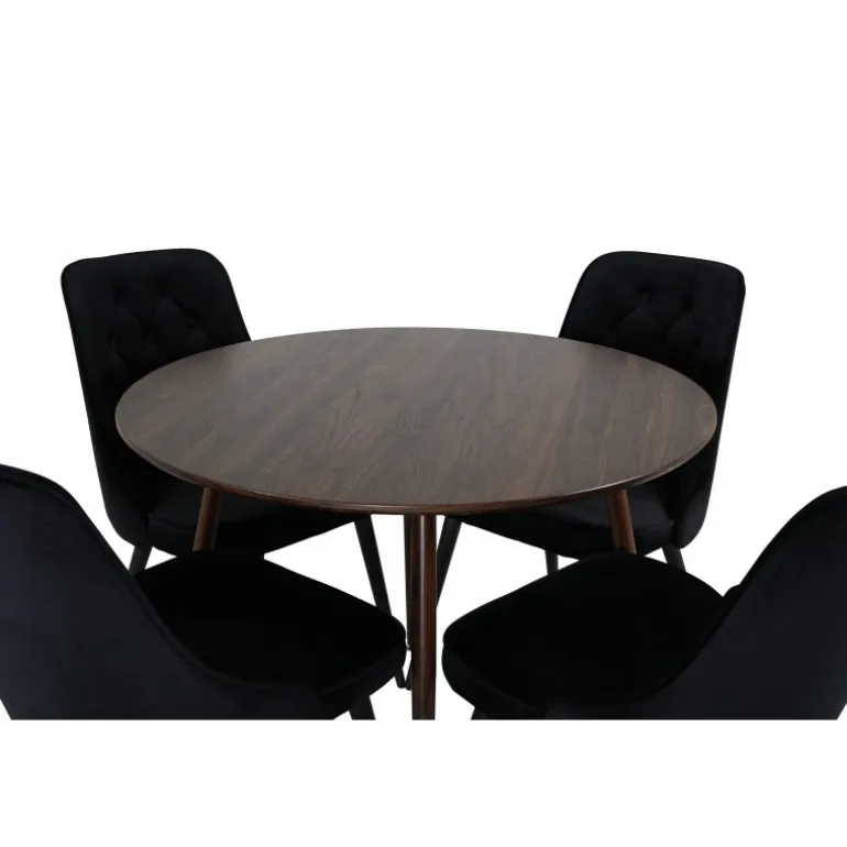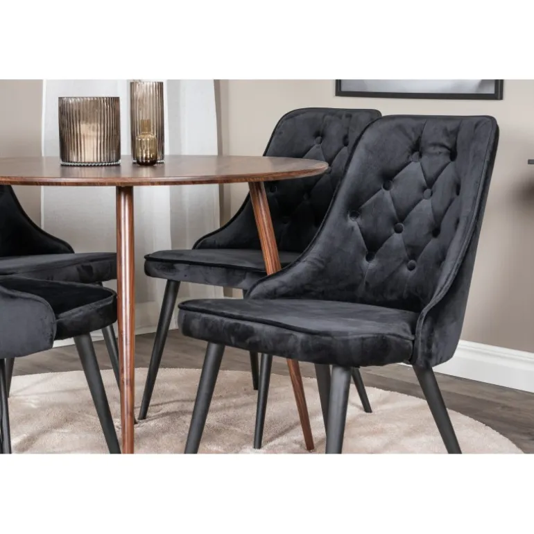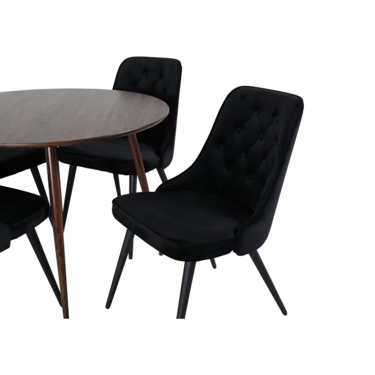 - Trendy farver: Spisebordet i valnød og stolene i sort giver en moderne og stilfuld look.