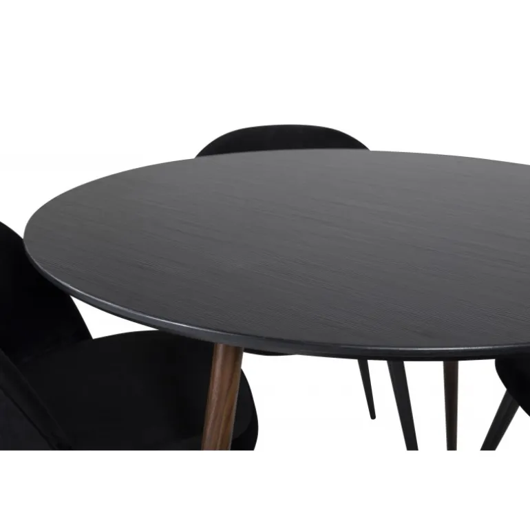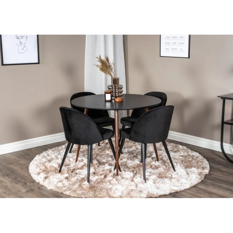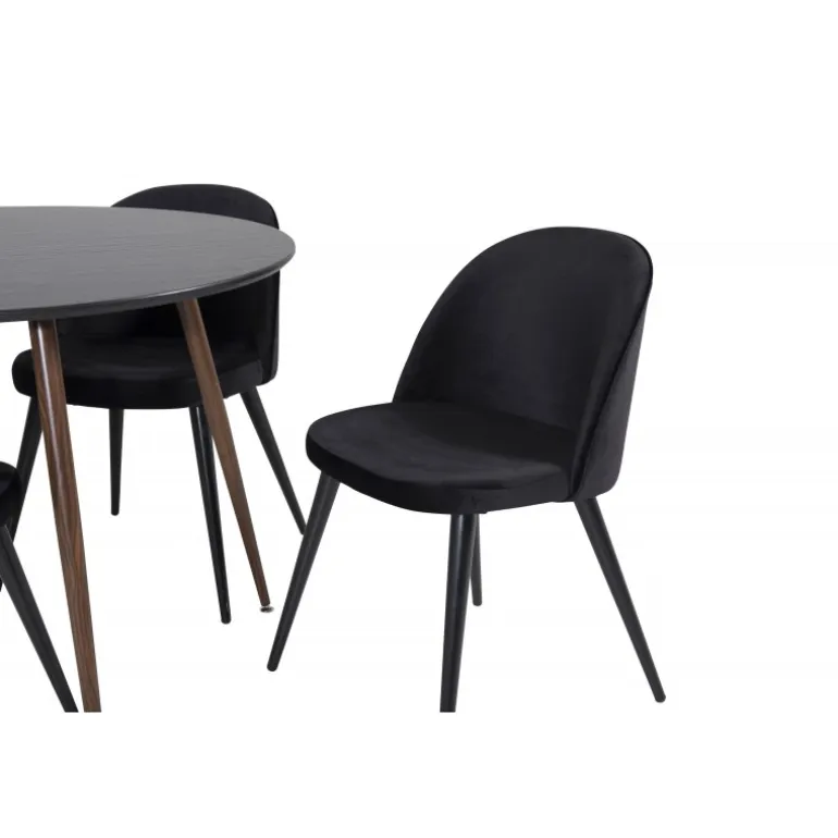 Vores populære Samets Stole i Velvet i perfekt kombination med Plaza Spisebord i elegant design! Et tidløst Spisebordssæt, der passer perfekt til alle anledninger. Dette sæt kombinerer moderne stil med fremragende funktionalitet, hvilket gør det ideelt til både hverdagsbrug og festlige sammenkomster. De sorte stole i blød polyester velvet giver en luksuriøs følelse, mens bordets robuste MDF og stålstruktur sikrer holdbarhed.