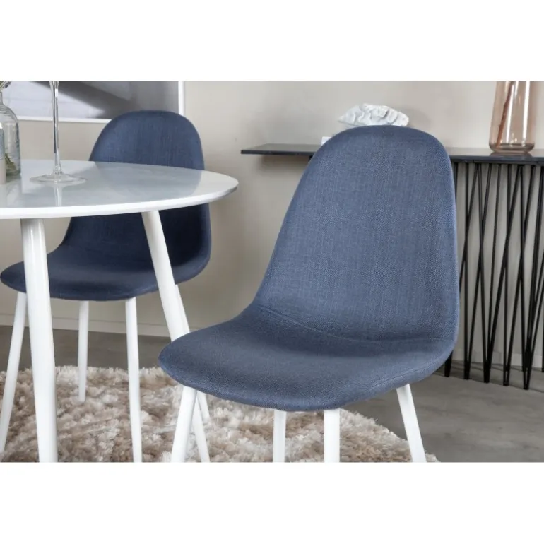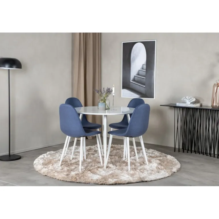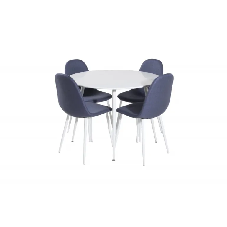Klassisk Spisebordssæt, der passer ind i de fleste husholdninger! Spisebordet Plaza sammen med stole i Polar-serien er perfekt til dem, der ønsker at skabe en hyggelig og moderne stemning i hjemmet. Plaza Rundt Spisebordssæt kombinerer stil og funktionalitet med sit hvide MDF-bord og komfortable blå stole. Dette sæt er ideelt til familiemiddage og sociale sammenkomster.