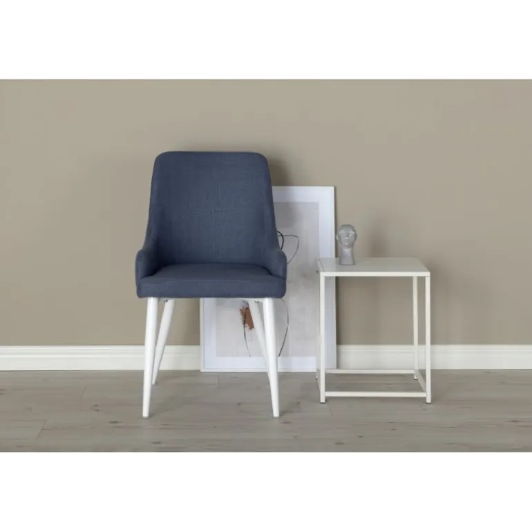 Så stilfuld som den er komfortabel at sidde på! Det gennemførte moderne design har en ramme i hvid pulverlakeret metal og ryglæn/sæde i blåt polyesterstof med blød polstring. Nogle samling påkrævet. Skab et charmerende midtpunkt i dit hjem med de slanke spisestole fra Plaza-serien! Plejeanvisning: Brug tekstilspray til at imprægnere stoffet før brug, hvilket også gør det lettere at fjerne snavs og pletter senere. Fjern pletter med det samme, gnid ikke, men prøv forsigtigt at suge dem op med en klud.