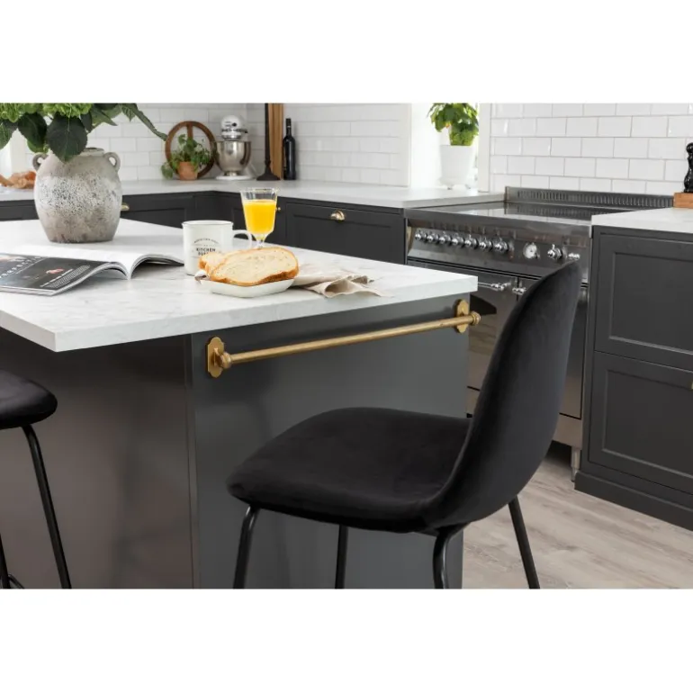 Med Polar barstolen behøver du hverken at gå på kompromis med design eller komfort! Designet er gennemtænkt med en fuldt polstret stol med afrundet ryg og sæde i sort fløjlstof samt smalle ben i sort pulverlakeret metal med integreret fodstøtte for ekstra komfort. Let samling kræves. Plejeråd: Brug tekstilspray til at imprægnere stoffet, før du begynder at bruge det; det vil også gøre eventuelle pletter nemmere at fjerne i fremtiden. Fjern straks pletter; gnid ikke, men forsøg at suge dem forsigtigt op med en klud.
