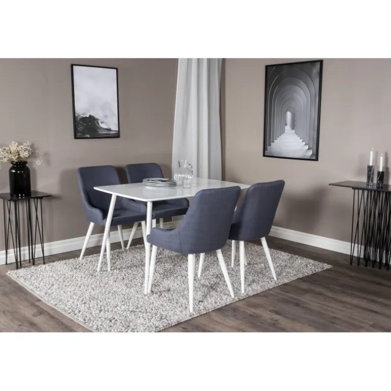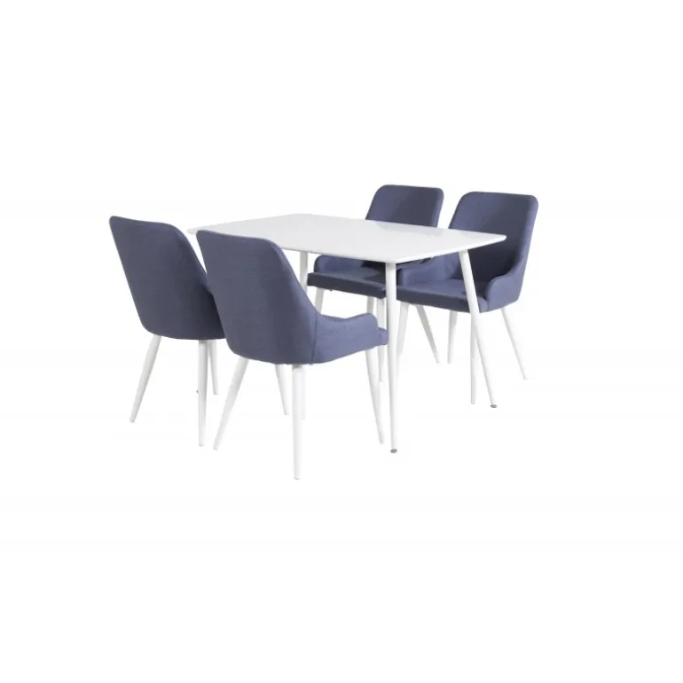 Enkelt madgruppe, der passer i de fleste husholdninger! Spisebord Polar sammen med sine venlige stole i Comfort-serien – her vil du være glad for at blive i godt selskab i lang tid! Dette moderne Spisebordssæt kombinerer stil og komfort, hvilket gør det til et perfekt valg for enhver spisestue. Polar Rundt Spisebordssæt tilbyder en elegant hvid bordplade og komfortable stole i blå og hvid, fremstillet af holdbare materialer som bøjet træ, skum, MDF og stål. Det er nemt at samle og passer perfekt til din daglige brug.