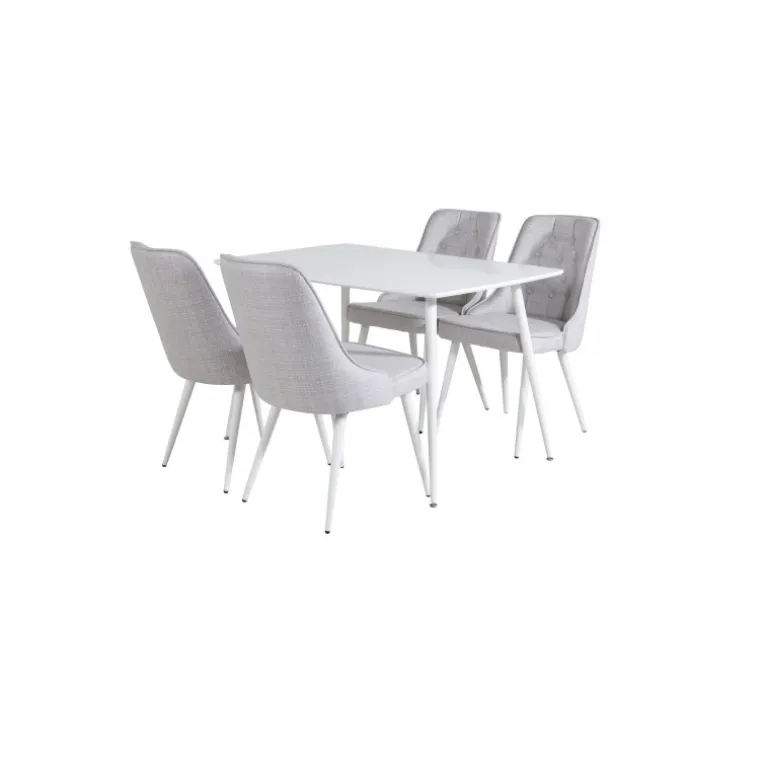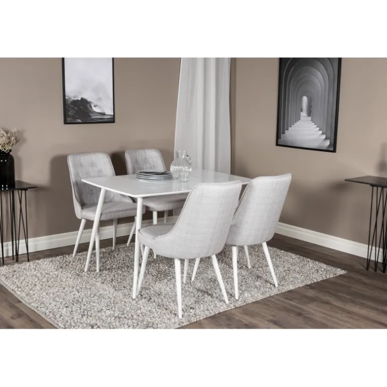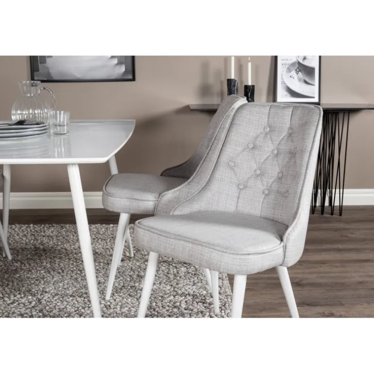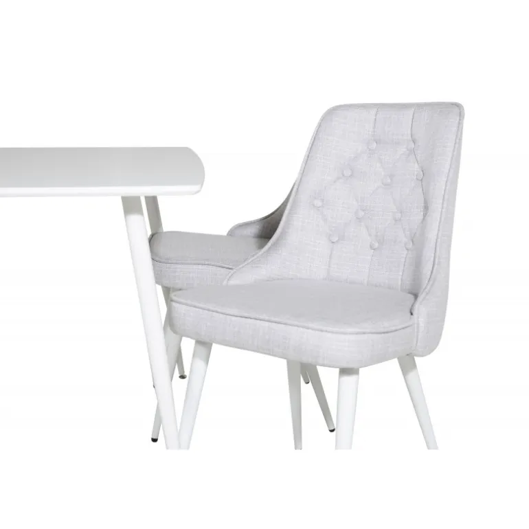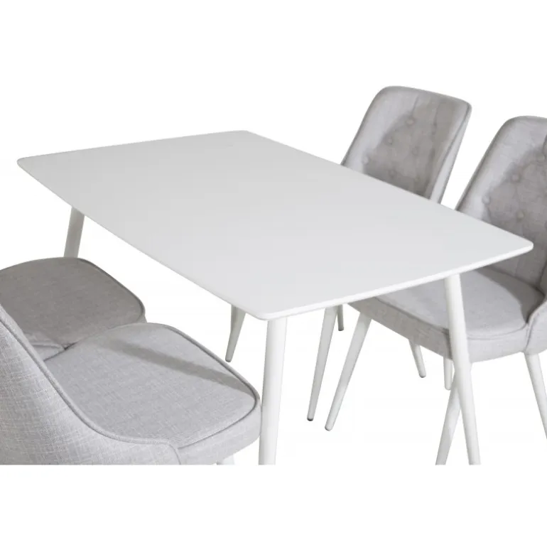 Vores enkle og klassiske spisebord Polar kombineret med vores luksuriøse spisebordsstole Velvet. Her får du en stilfuld kombination, der står tidens prøve. Inviter til middag og socialt samvær med dette elegante sæt. Bordet og stolene er fremstillet af holdbare materialer som MDF, krydsfiner og stål, hvilket sikrer langvarig brug. Fås i hvid og grå, hvilket passer perfekt til ethvert interiør.