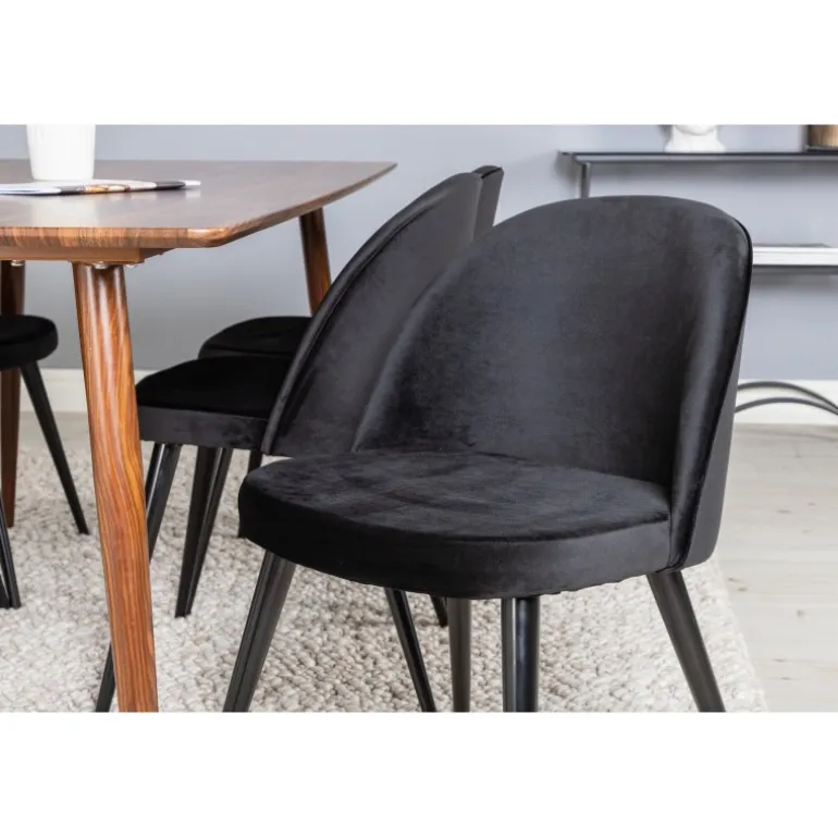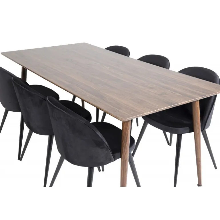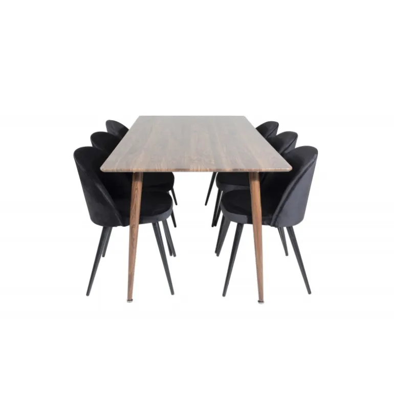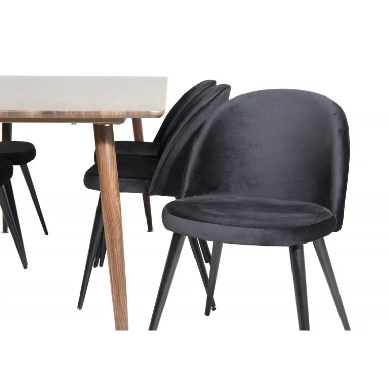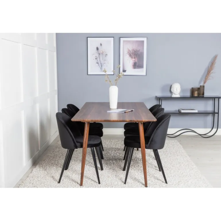 Vores spisebord Polar i rustikt design sammen med vores siddevenlige spisebordsstole Velvet giver dig en luksuriøs og stilfuld kombination, der holder over tid. Inviter til middag og socialt samvær med dette tidløse møbelsæt. Polar Rektangulær Spisebordssæt er skabt til at imponere med sin robuste MDF-bordplade og elegante stålben. De sorte Velvet stole tilføjer et moderne touch til dit spisestueområde.