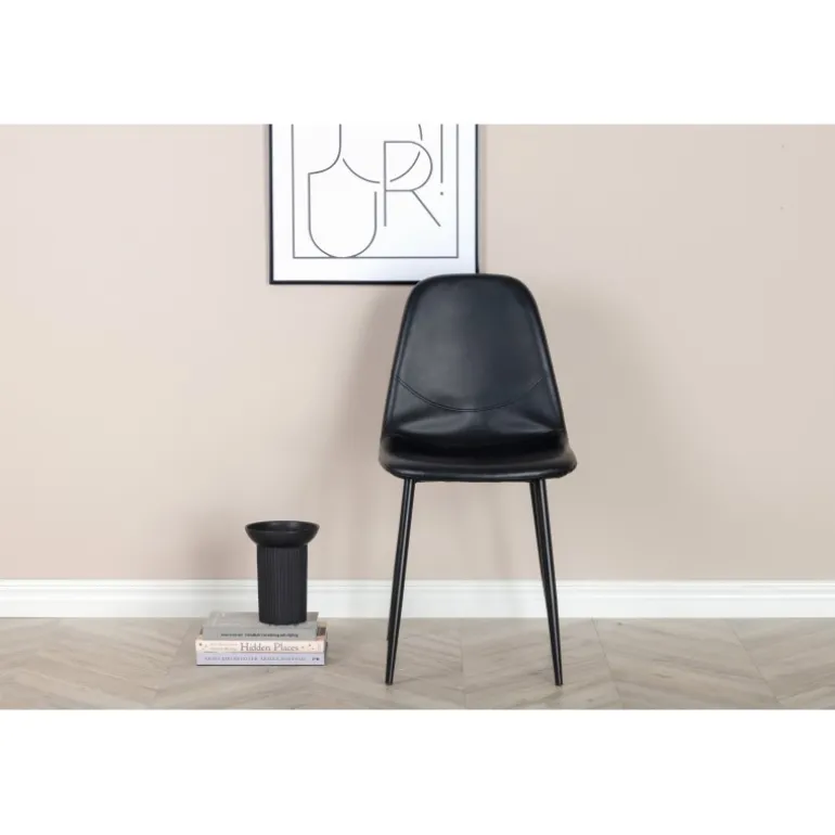 En robust spisebordsstol fra Polar-serien i skinnende sort kunstlæder med blød polstring! Denne spisebordsstol i et fuldt beklædt design med let afrundet ryg og ben i sort pulverlakeret metal er lige så komfortabel som den er iøjnefaldende. Møblér hjemmets hjerte indbydende og hyggeligt og nyd dejlige måltider sammen! Enkel samling kræves. Plejeråd: Kunstlæder er godt at rengøre med en blød, fugtig bomuldsklud. Ved svære pletter kan en fugtet bomuldsklud og et middel beregnet til rengøring af bycast & PU anvendes. Prøv først på et ikke-synligt område, da nogle midler kan have forskellige sammensætninger.