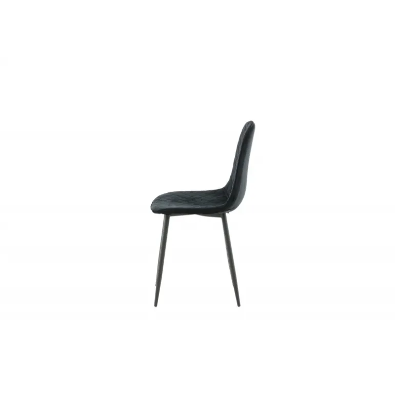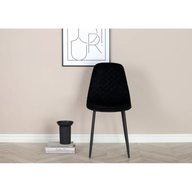 Elegant spisebordsstol med enkelt design og stilfulde detaljer! Spisebordsstolen fra Polar-serien har et gennemtænkt design med en let afrundet ryg og en blød sæde i polstret sort velourstof med dekorative sømme på indersiden, der danner et dekorativt diamantmønster. Benene er i sort pulverlakeret metal. Nogle samling kræves. Sid komfortabelt og skab et moderne fokuspunkt i stuen. Plejeinstruktioner: Brug stofspray til at imprægnere stoffet, før det tages i brug, hvilket også gør det lettere at fjerne snavs og pletter i fremtiden. Fjern pletter straks, gnid ikke, men prøv at absorbere dem forsigtigt med en klud.