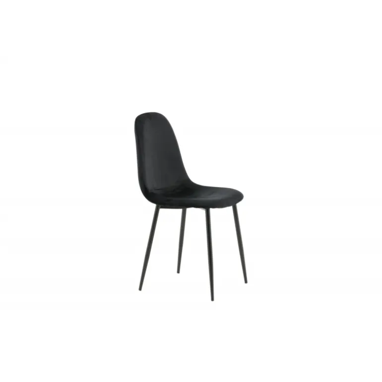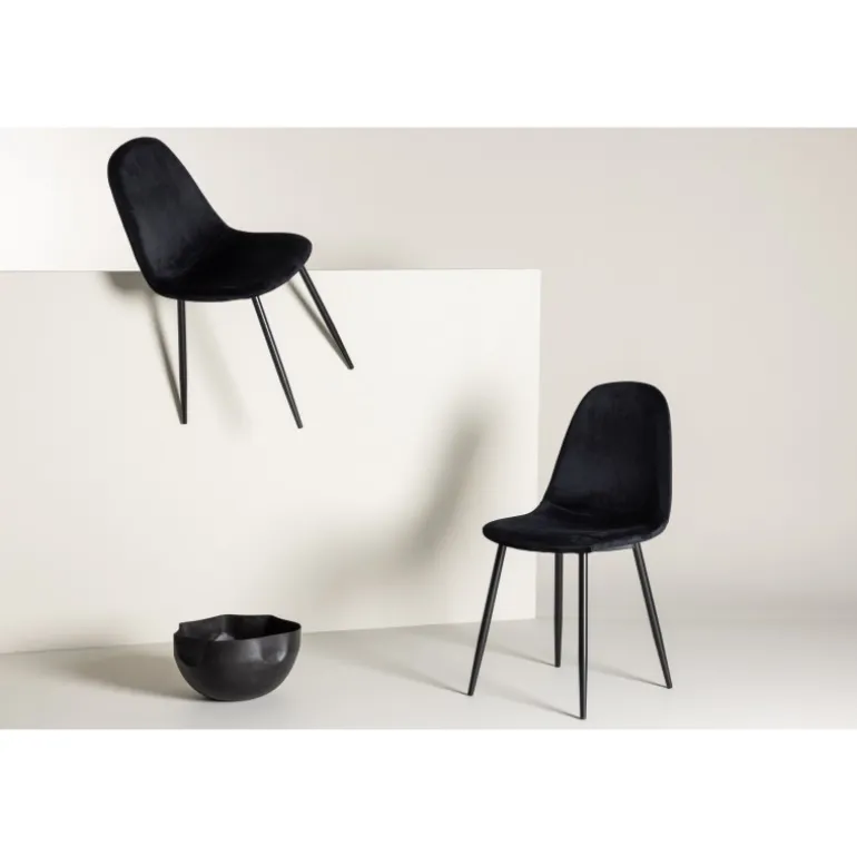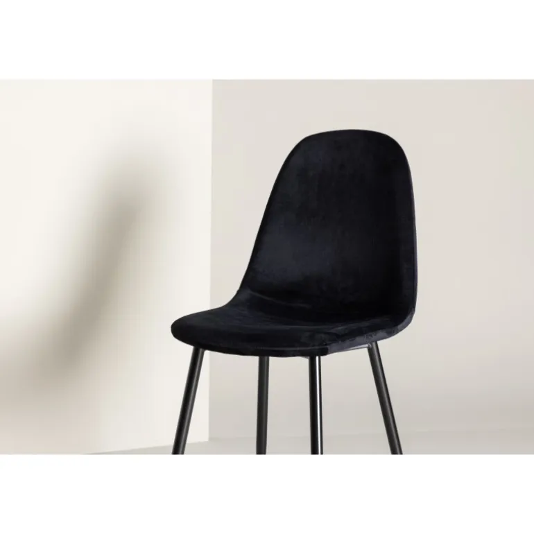 Sofistikeret spisestol i gennemført sort farve med moderne design – hvad mere kan man ønske sig? Polar har et fuldt polstret design, ben i sort pulverlakeret metal og en afrundet ryg og sæde i sort fløjlsstof med blød polstring. Undgå kompromiser mellem komfort og design! Nogle samlinger kræves. Plejeinstruktioner: Fløjl har tendens til at få aftryk, når bunken ligger ned. Aftrykkene kan få stoffet til at se slidt ud, hvilket er normalt for denne type materiale. Afhængigt af, hvordan lyset falder, kan stoffet skifte i flere forskellige nuancer.