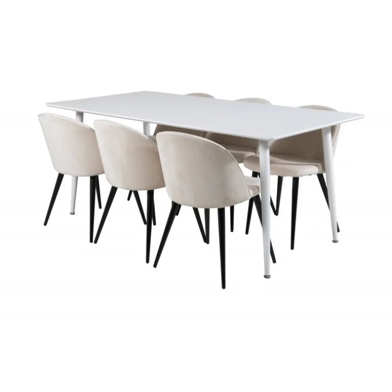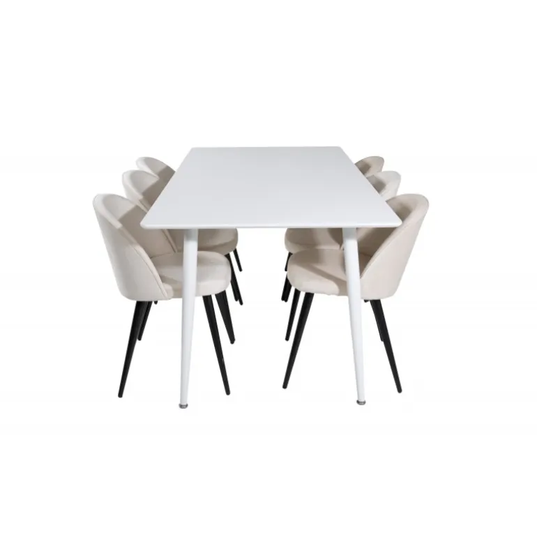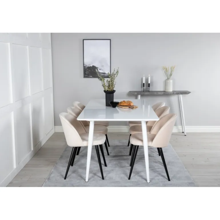 Vores enkle og klassiske spisebord Polar sammen med vores komfortable spisebordsstole Velvet. Her får du en luksuriøs og stilfuld kombination, der holder over tid. Inviter til middag og socialt samvær!