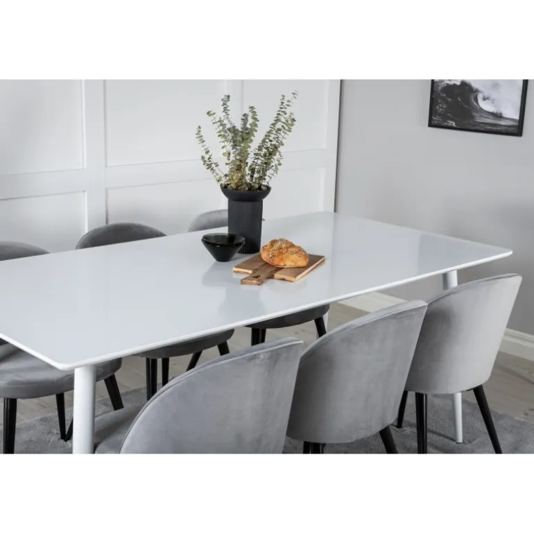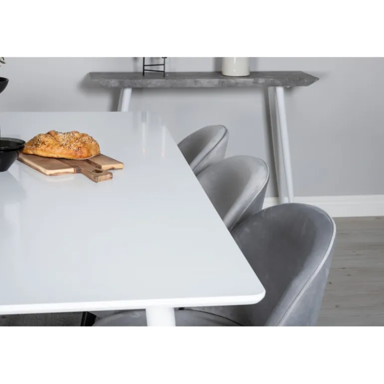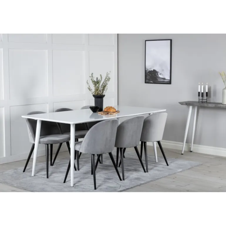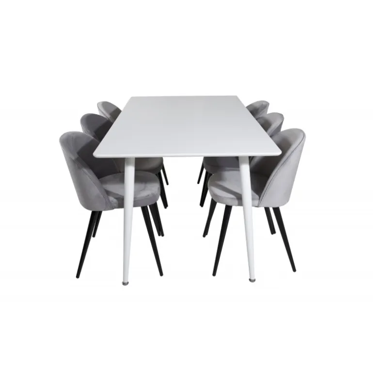 Vores enkle og klassiske spisebord Polar sammen med vores siddevenlige spisestole Velvet. Her får du en luksuriøs og stilfuld kombination, der holder over tid. Inviter til middag og socialt samvær med dette sæt, der emmer af elegance og komfort. Perfekt til både daglig brug og særlige lejligheder.