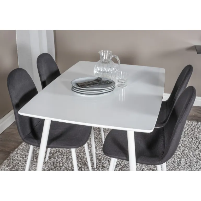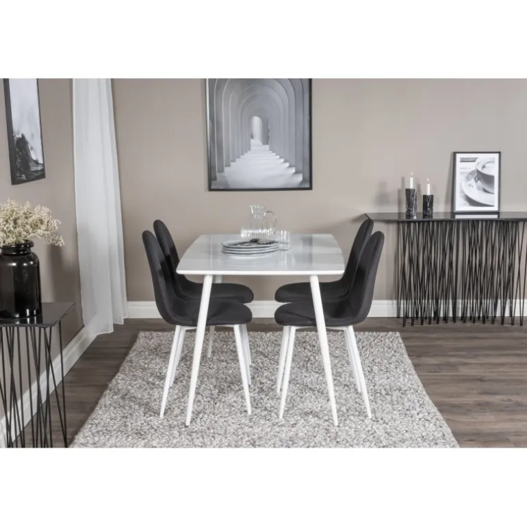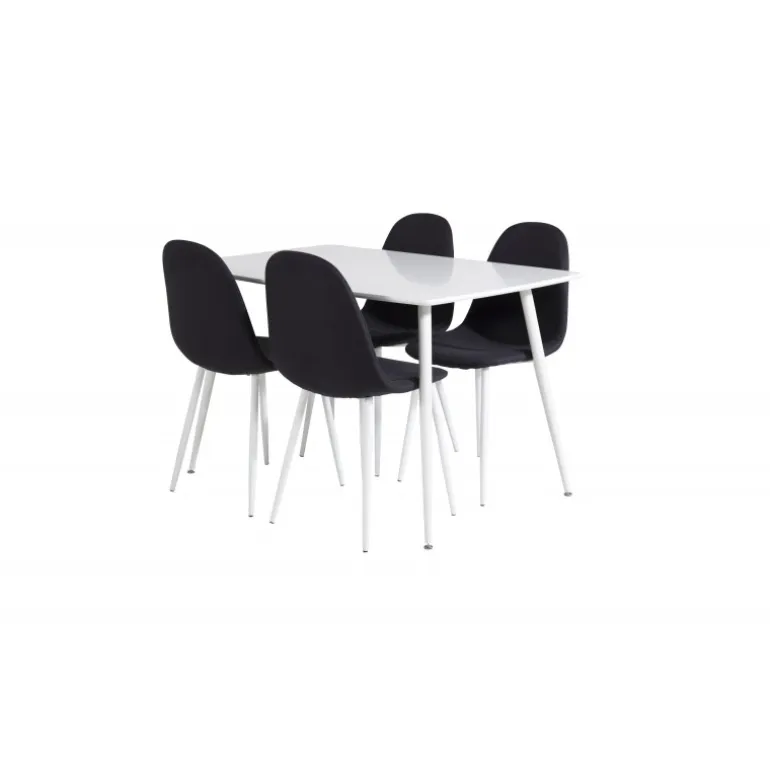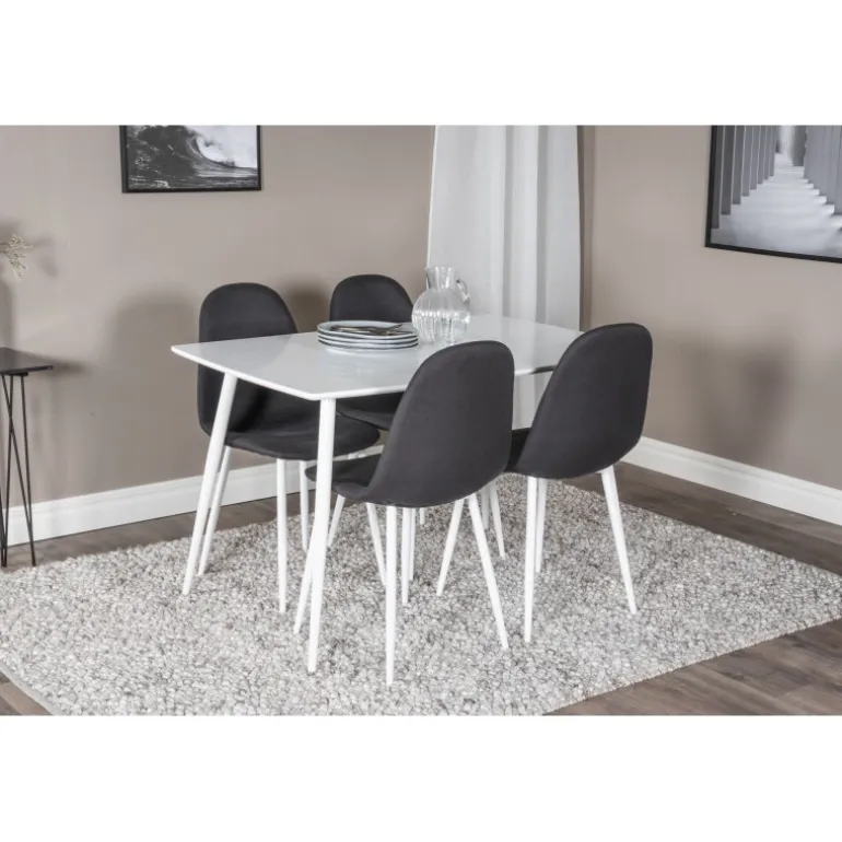 Vores enkle og klassiske spisebord Polar sammen med vores siddevenlige spisebordsstole i samme serie. Her får du en stilfuld og tidløs kombination, der holder over tid. Inviter til middag og socialt samvær med dette elegante sæt. Montering kræves, men resultatet er værd at vente på. Fås i farverne sort og hvid.