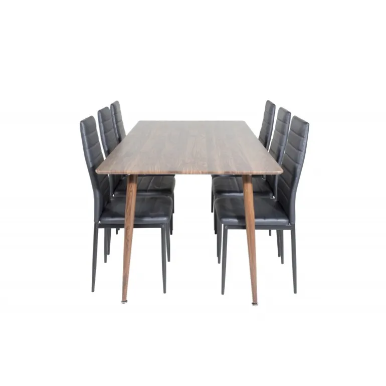 Polar, moderne og pænt spisebord – her sammen med høje læderlignende spisestole i Slim serien. Skab noget pænt og socialt med plads til god mad og hyggeligt samvær! Dette sæt kombinerer stil og funktionalitet med sit naturfarvede MDF-bord og sorte, læderlignende stole, hvilket gør det perfekt til enhver spisestue. Montering krævet.