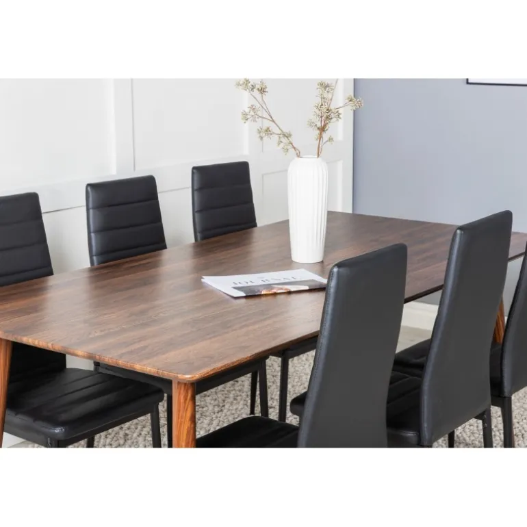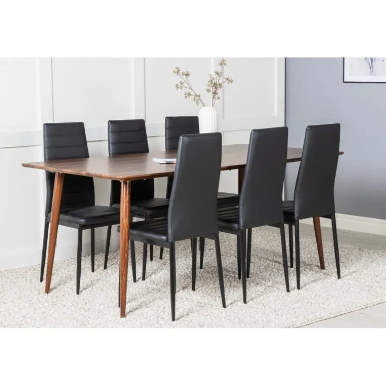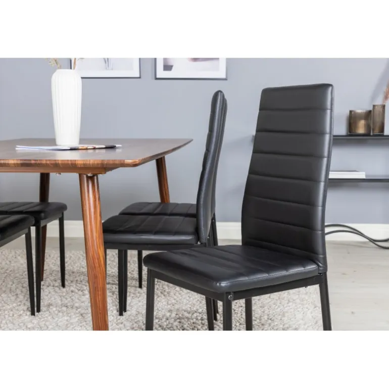 - Farvekombination: Naturfarvet bord med sorte læderlignende stole for et elegant look.