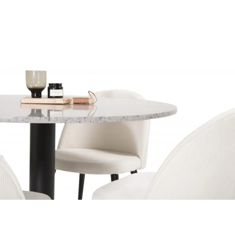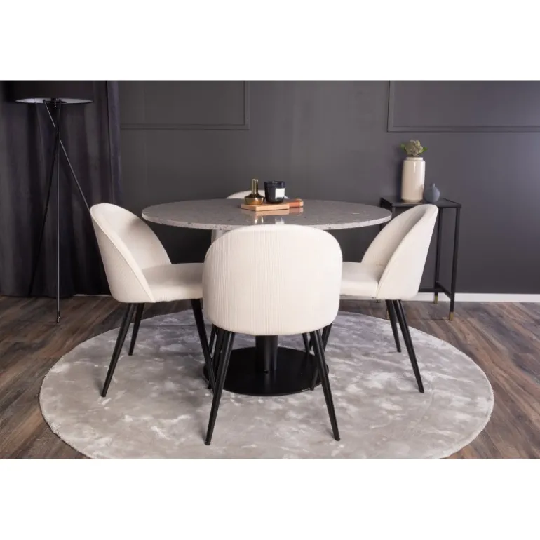 Oplev den perfekte kombination af moderne, hyggelig og tidløs stil med vores Razzia Rund Spisebordssæt. Dette sæt kombinerer forskellige farver og materialer på en måde, der skaber en harmonisk og stilfuld spiseoplevelse. Med et terrazzo bord og polstrede stole i polyesterfløjl, tilbyder dette sæt både komfort og elegance til dit hjem. Sættet kommer i flere farvekombinationer, så du kan vælge den, der passer bedst til dit interiør.