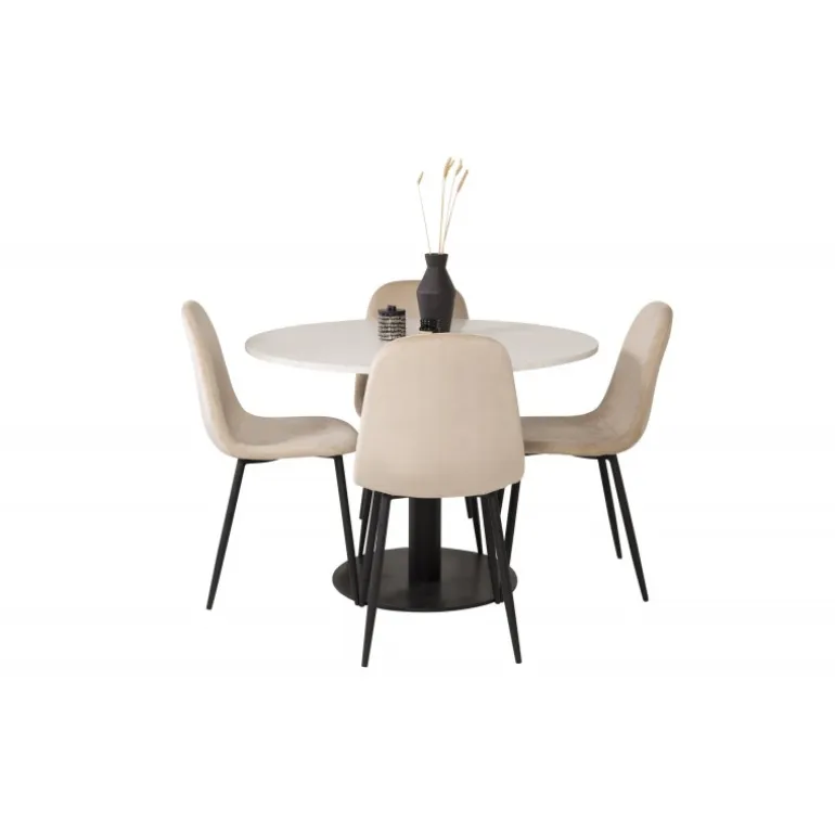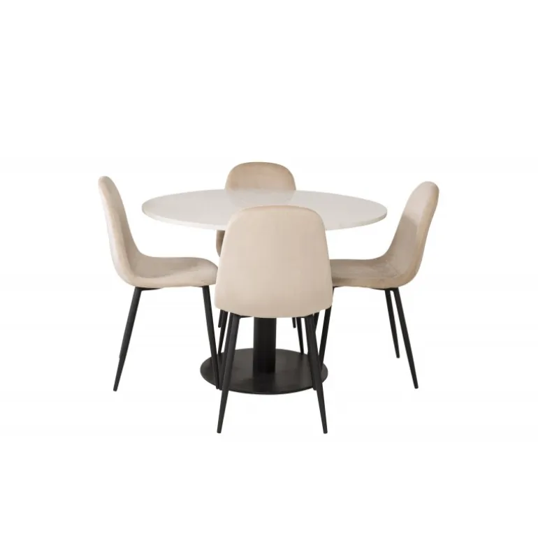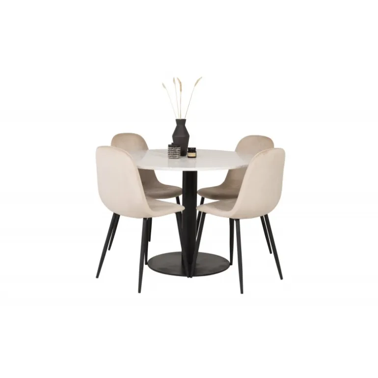 Nyd hyggelige måltider omkring Razzia Rund Spisebordssæt. Dette elegante sæt kombinerer Razzia-seriens sofistikerede design med de komfortable, bløde spisestole fra Polar-serien. Med dette sæt får du en madgruppe, der vil imponere enhver gæst! Bordet er lavet af holdbart stål og terrazzo, mens stolene er konstrueret af bøjetræ og skum for maksimal komfort. Fås i en række farver for at passe til enhver indretning.