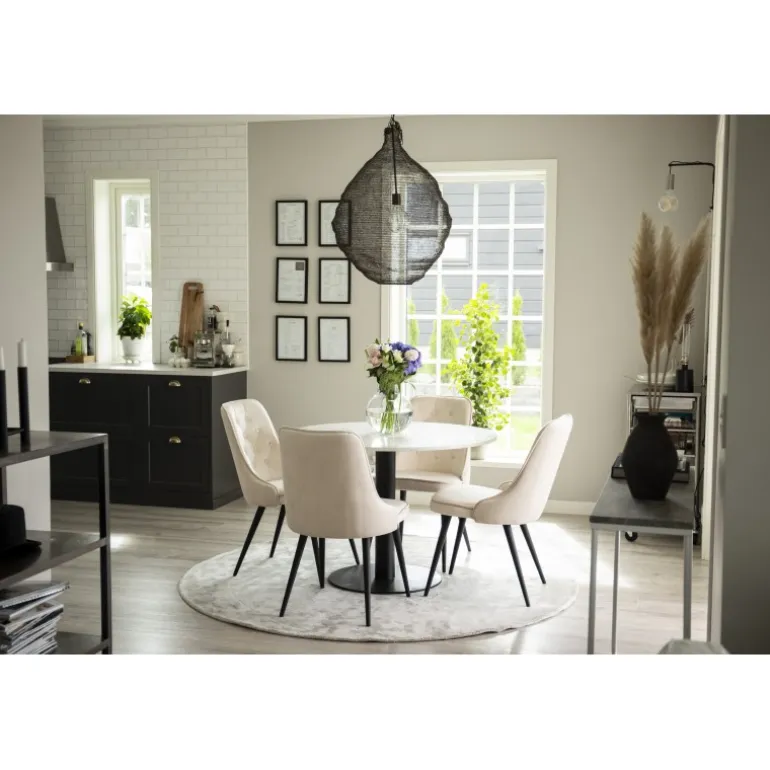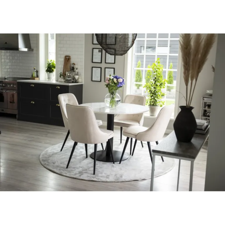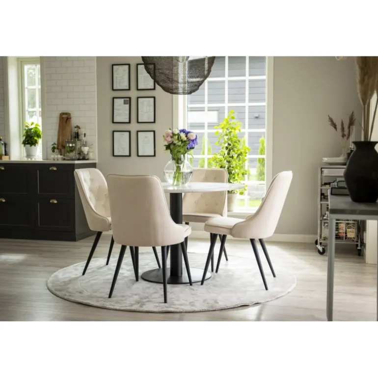 Estelle, et smukt marmorbord, der her er kombineret med spisebordsstole fra Velvet. Skab noget stilfuldt og socialt – her sidder du gerne længe og nyder godt selskab med venner! Dette Razzia Rundt Spisebordssæt kombinerer elegant design med funktionalitet, hvilket gør det til det perfekte valg for din spisestue.