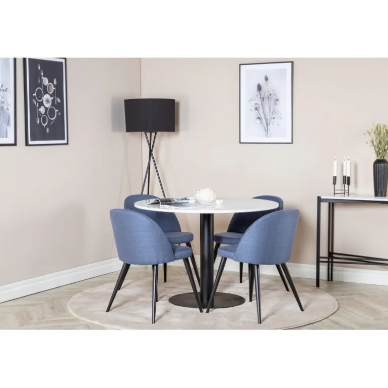 Oplev elegance og stil med vores Razzia Rund Spisebordssæt. Dette sæt inkluderer et rundt spisebord og stilfulde stole fra Velvet-serien. Med et moderne og sofistikeret design passer dette sæt perfekt ind i de fleste hjem. Bordpladen i hvid terrazzo kombineret med stole i sort eller blå polyester skaber en unik og indbydende atmosfære. Gør dine måltider til særlige øjeblikke med dette stilfulde Spisebordssæt.