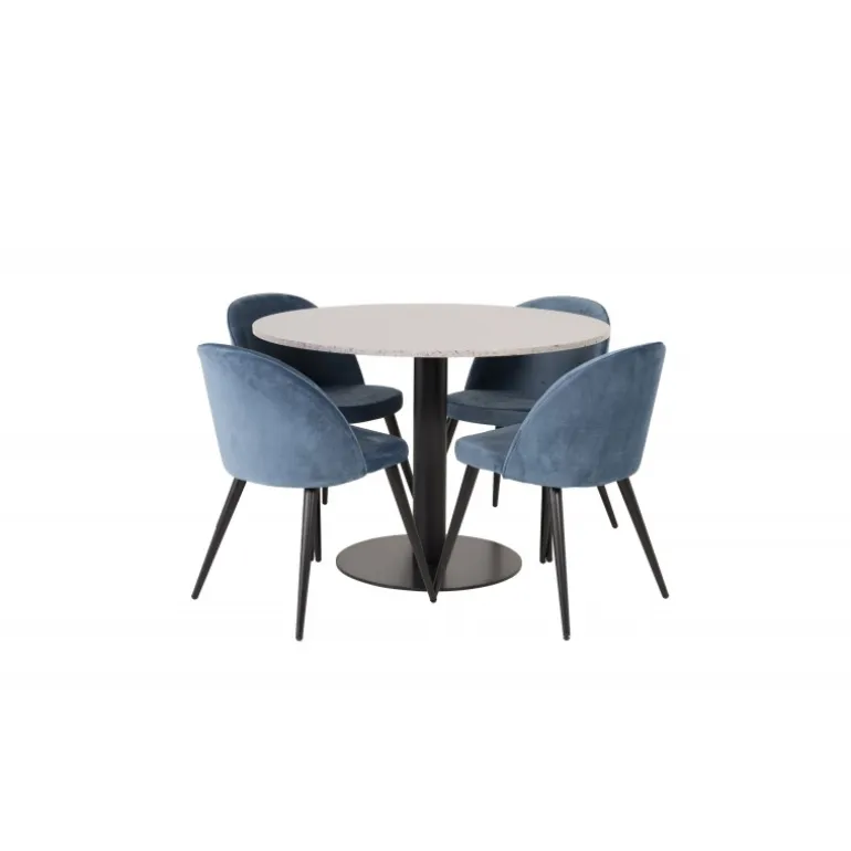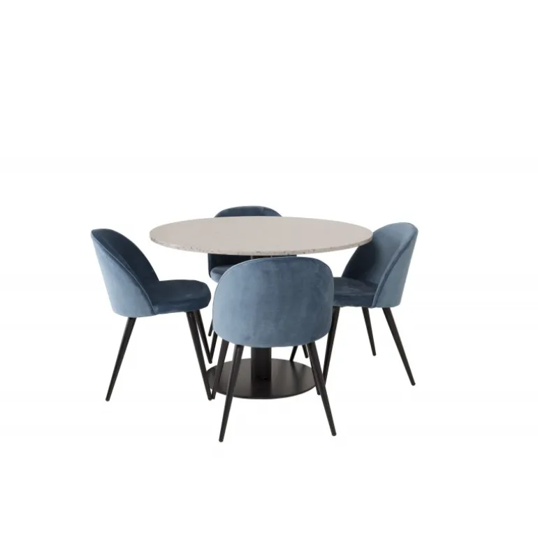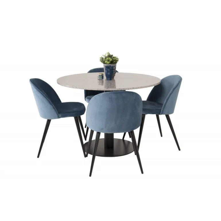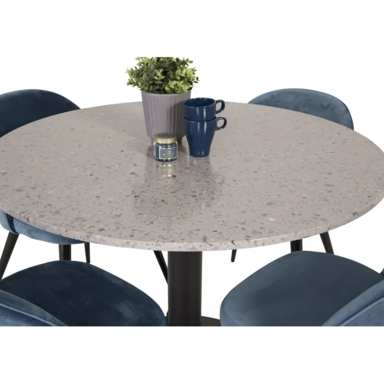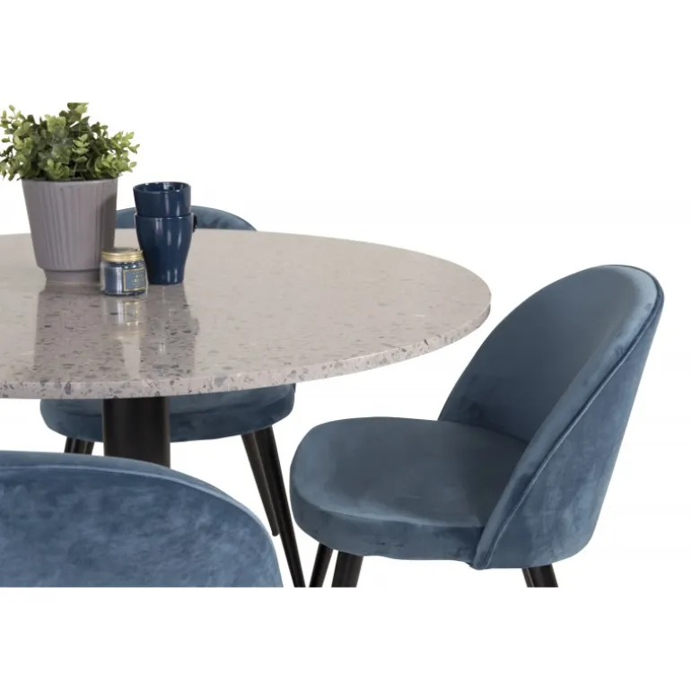 - Moderne Design: Elegant rundt bord med terrazzo bordplade og Velvet spisestole.