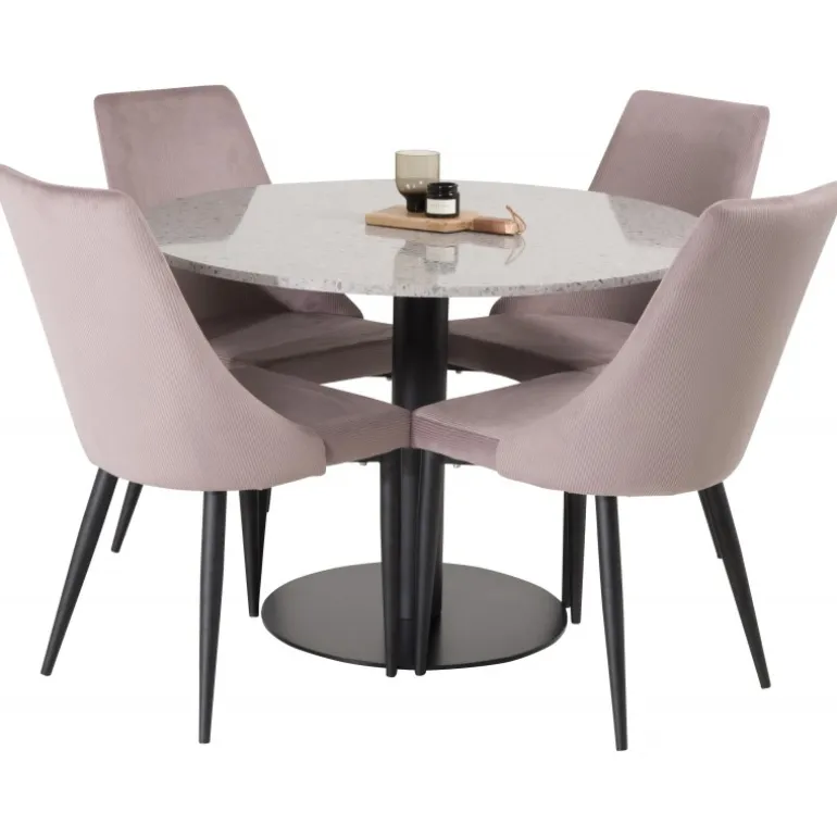 Kombinationen af forskellige farver og materialer skaber ofte en stor succes. Med vores Razzia spisebord og Leone spisebordsstole får du en kombination, der er både moderne, hyggelig og tidløs! Dette sæt er perfekt til enhver spisestue, der ønsker at kombinere stil med funktionalitet. Bordet har en elegant grå terrazzo bordplade, mens stolene er betrukket med støvet pink polyester kordfløjl, hvilket giver en luksuriøs følelse.