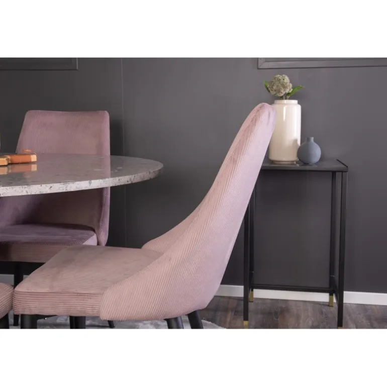 - Holdbare Materialer: Bordplade i grå terrazzo og stole betrukket med støvet pink polyester kordfløjl.