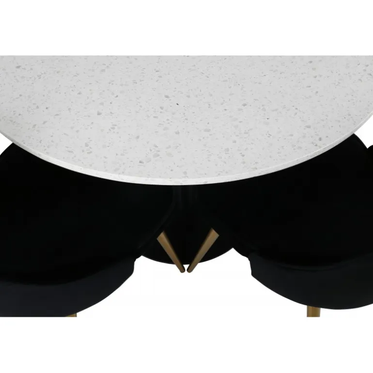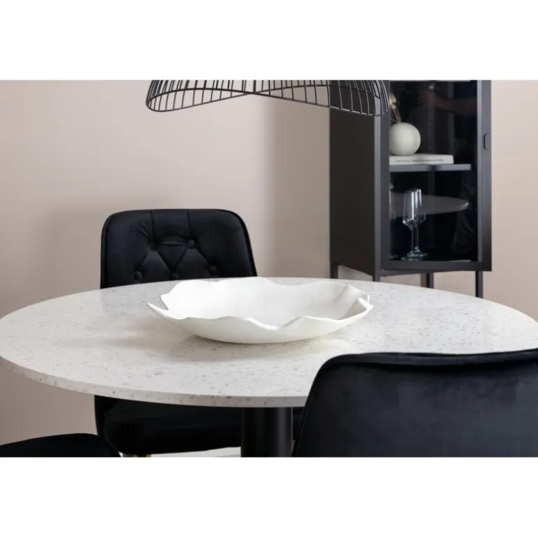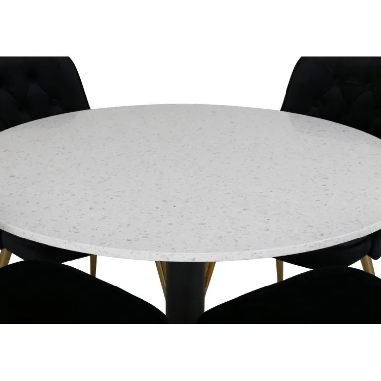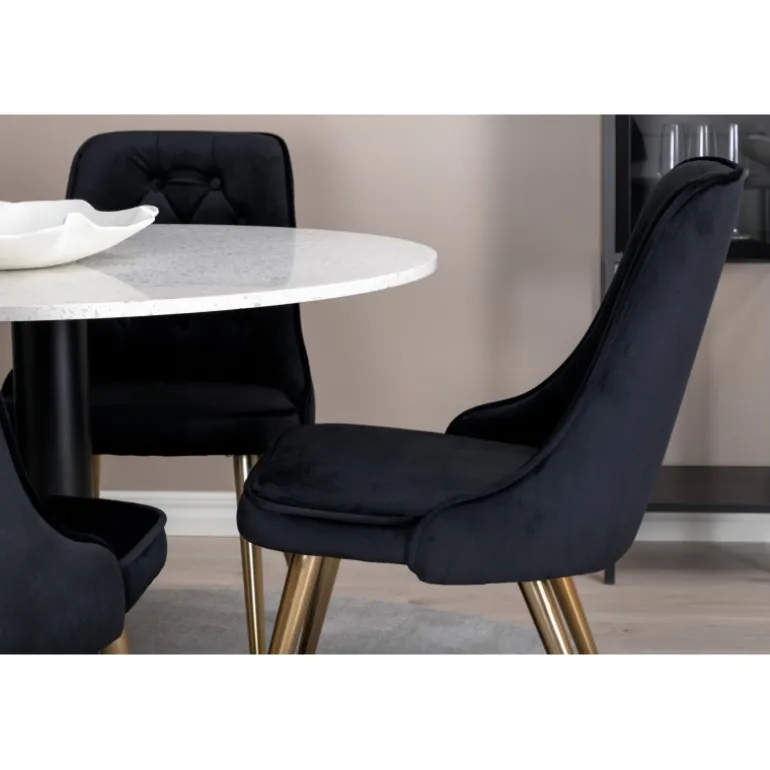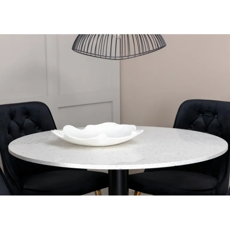 Elegant, pompøst og komfortabelt Spisebordssæt – hvad mere kan man ønske sig? Spisebordet Razzia har en rund bordplade i smuk terrazzo med hvid finish og en cylinderformet ramme i sort metal. Dette kombineres med stilfulde spisebordsstole fra Velvet Deluxe-serien. Stolen har et fuldt polstret design, ben i messingpoleret metal og en rundet ryg og sæde i lækker sort fløjlsstof med blød polstring og dekorative knapper. Her sidder du komfortabelt i lang tid!