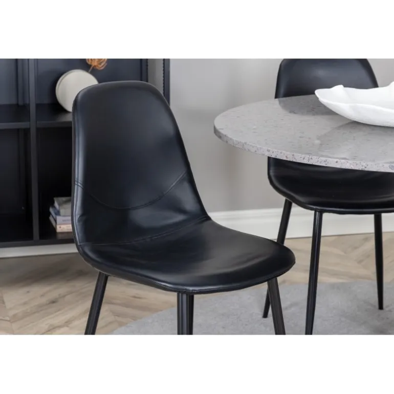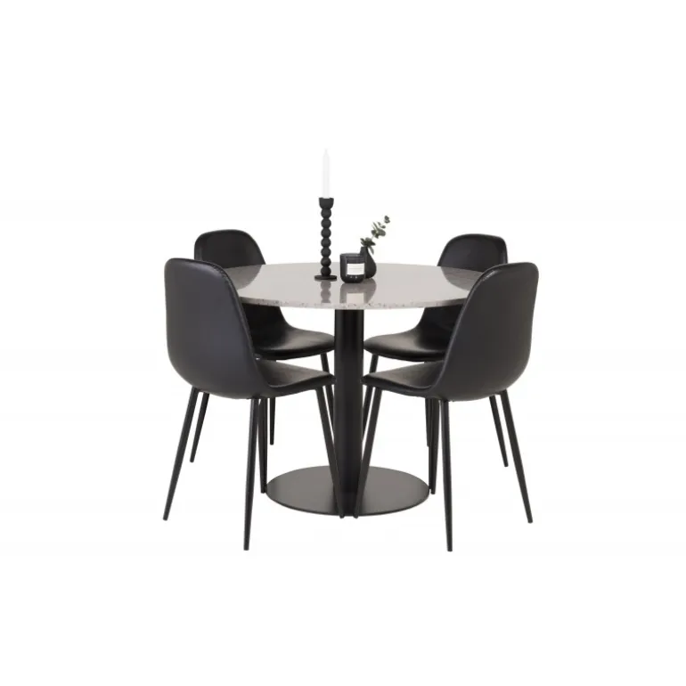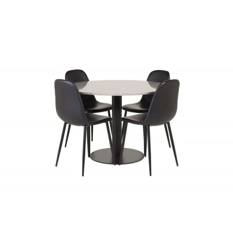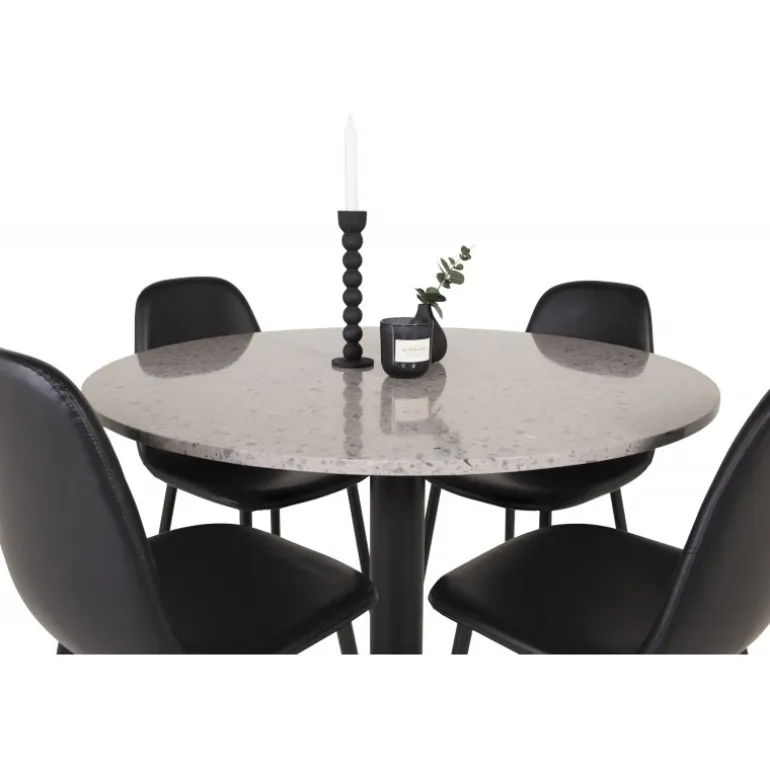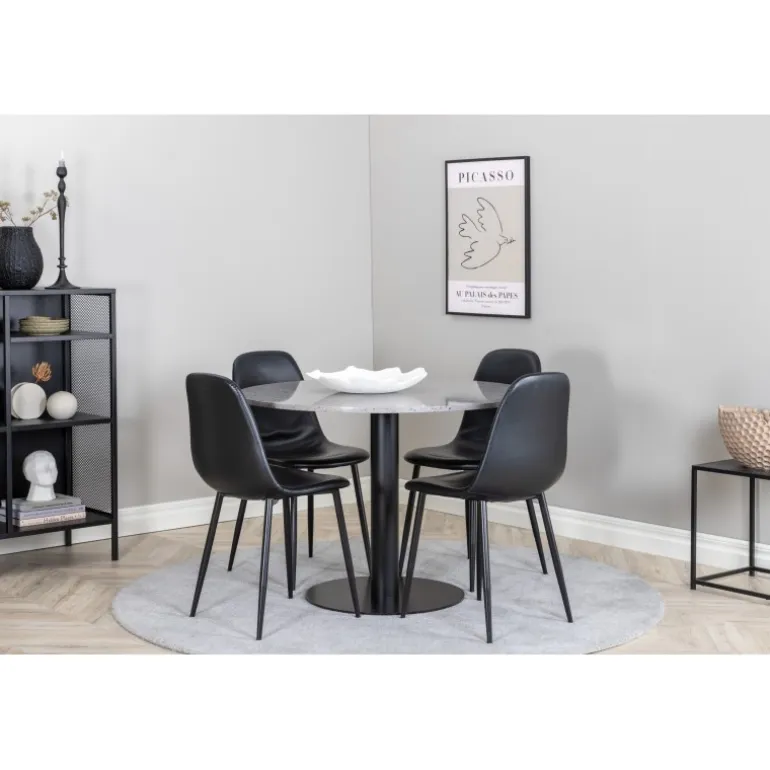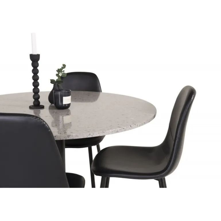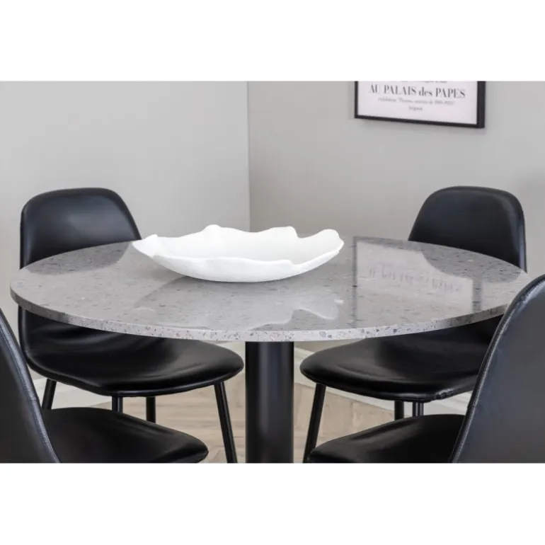Razzia Rundt Spisebordssæt er et elegant og enkelt valg til dit hjem. Dette sæt kombinerer bord fra Razzia-serien og stole fra Polar-serien, hvilket giver et neutralt og alsidigt design, der passer ind i de fleste miljøer. Med sit minimalistiske udseende skaber det en følelse af enkelhed og ro i dit spiseområde. Bordet har en grå terrazzo bordplade og stålben, mens stolene er lavet af bøgetræ, skum og PU, hvilket sikrer både komfort og holdbarhed. Vær opmærksom på, at montering er påkrævet.