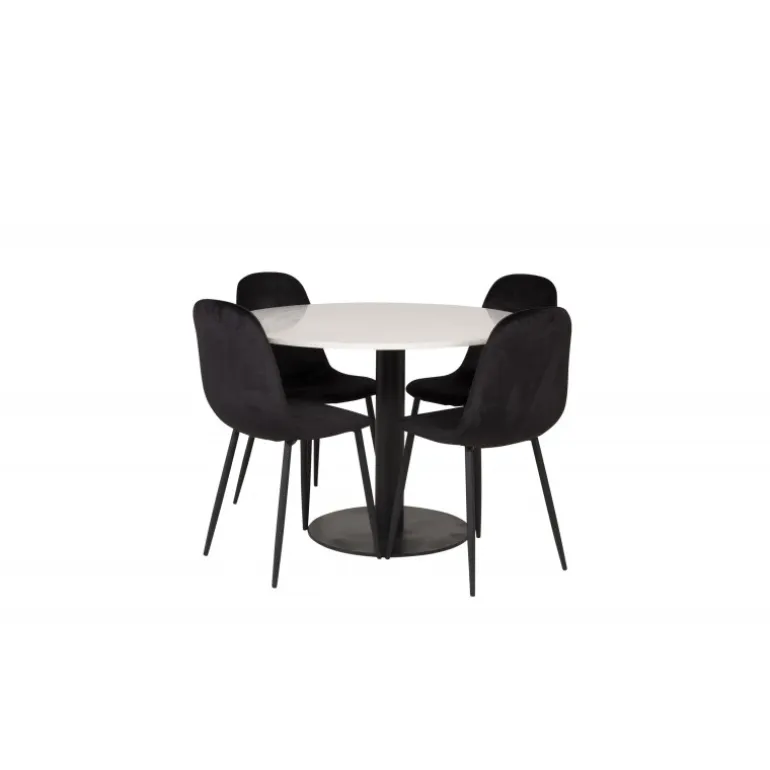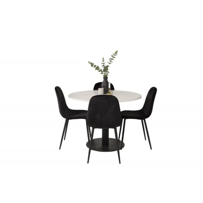 - Moderne Farver: Bordet i hvid og sort, stole i sort.