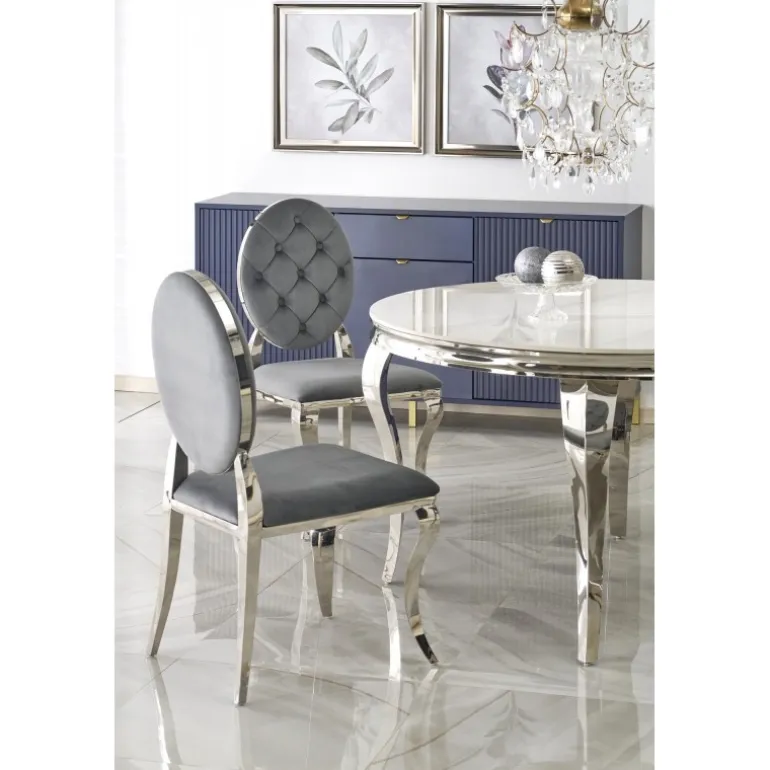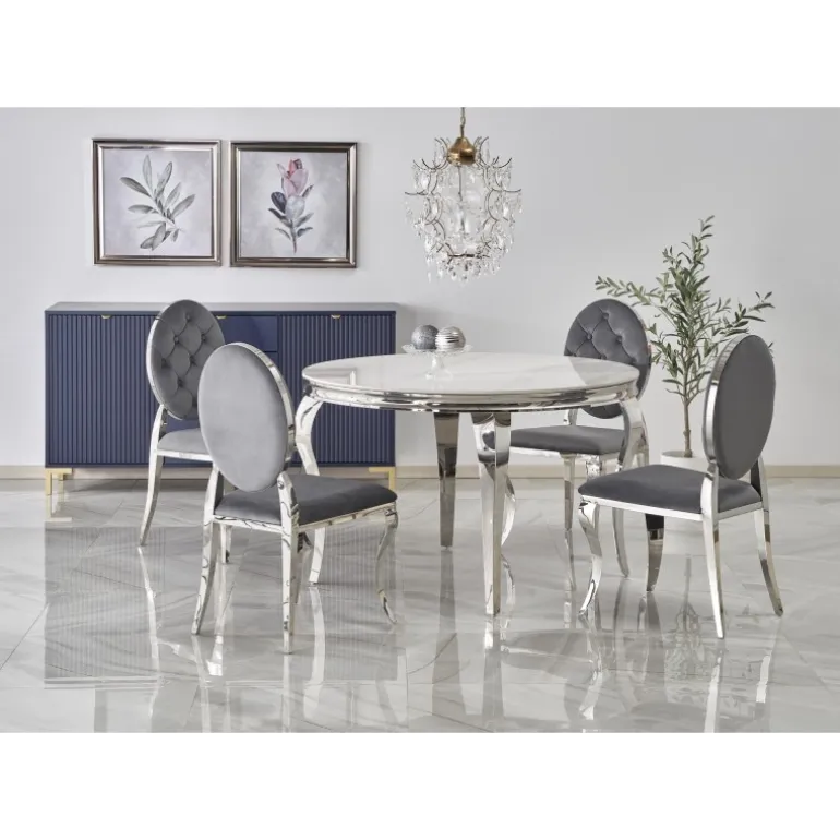 REGINALD bord kombinerer luksuriøst design og robust konstruktion for at give dit hjem et elegant præg. Med en bordplade i hvid marmor og ben i sølv rustfrit stål, er dette bord både stilfuldt og holdbart. Målene er 120/76/77 cm, hvilket gør det ideelt til både spise- og opholdsstuer. Materialerne består af sinteret sten og rustfrit stål, som sikrer langvarig kvalitet og let vedligeholdelse.