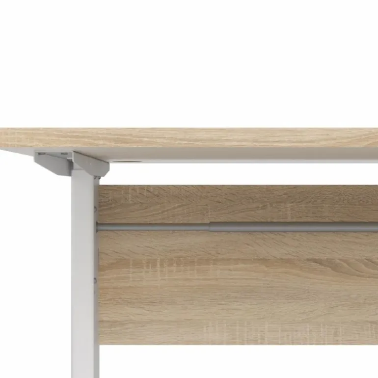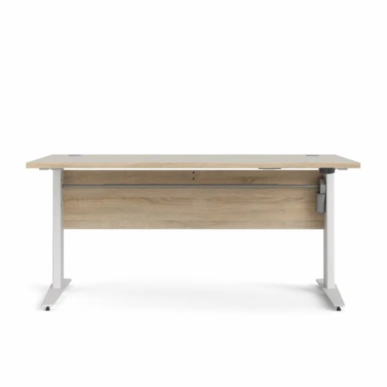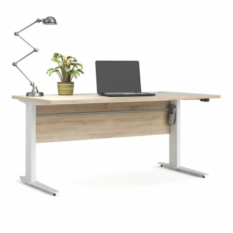 Rio hæve/sænke skrivebord i eg struktur med sølvgrå stålben, der let kan justeres, så bordet kommer til at stå helt lige. Skrivebordet er solidt udført og i et enkelt og lækkert design, der kan passe ind i ethvert kontor.