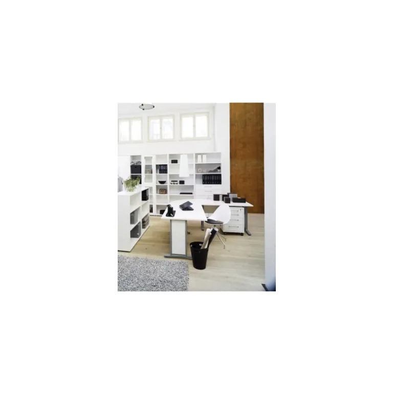 Stort Rio hjørneskrivebord i hvid med sølvgrå stålben, der let kan justeres, så bordet kommer til at stå helt lige. Ideelt skrivebord til det større hjemmekontor. Skuffesektion med hjul og lås medfølger. Skuffesektionen indeholder 4 skuffer med metalgreb hvoraf den øverste skuffe er med lås.