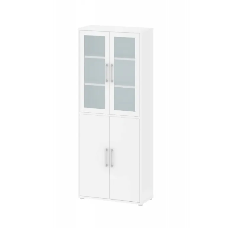 Rio skab i hvid. Skabet har 2 glaslåger og 2 hvide låger inkl. 4 hylder. I Rio serien findes der skriveborde, kassetter og reoler, som kan kombineres med forskellige låger, skuffer og greb. Rio er et fleksibelt system så du selv kan sammensætte det efter dit behov.