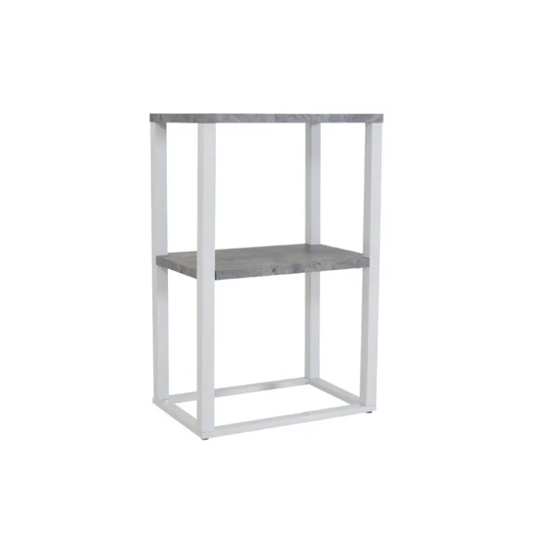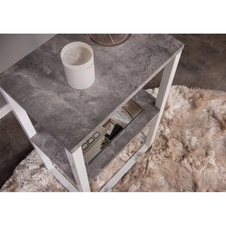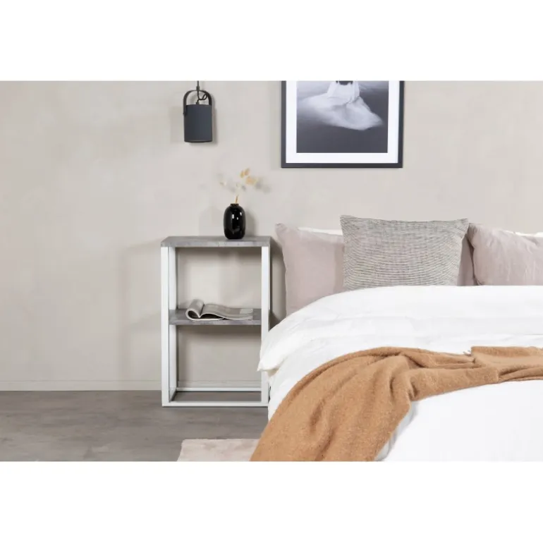 En natbord med et moderne og praktisk design! Rise bord har to smarte hylder i MDF med en lækker betonimitation. Den grå overflade passer perfekt sammen med kroppen i hvid metal og gør bordet let at matche med anden indretning. Den smalle struktur giver et stilfuldt indtryk. Placer det i soveværelset som et natbord eller i stuen som et sidebord – anvendelsesmulighederne er brede! Bordene i Rise-serien fås også i rustikt trælook. Plejeråd: MDF-plader der er malet eller lakeret er følsomme over for ridser og skader. Vær derfor forsigtig med pladerne for at undgå dette. Overflader malet med lak med farvepigment eller maling har en pigmentering, der giver en ikke-dækkende gennemsigtig overflade. Fødevarer som sodavand, rødvin og kaffe indeholder farvestoffer, som hvide lakker er ekstra følsomme over for.