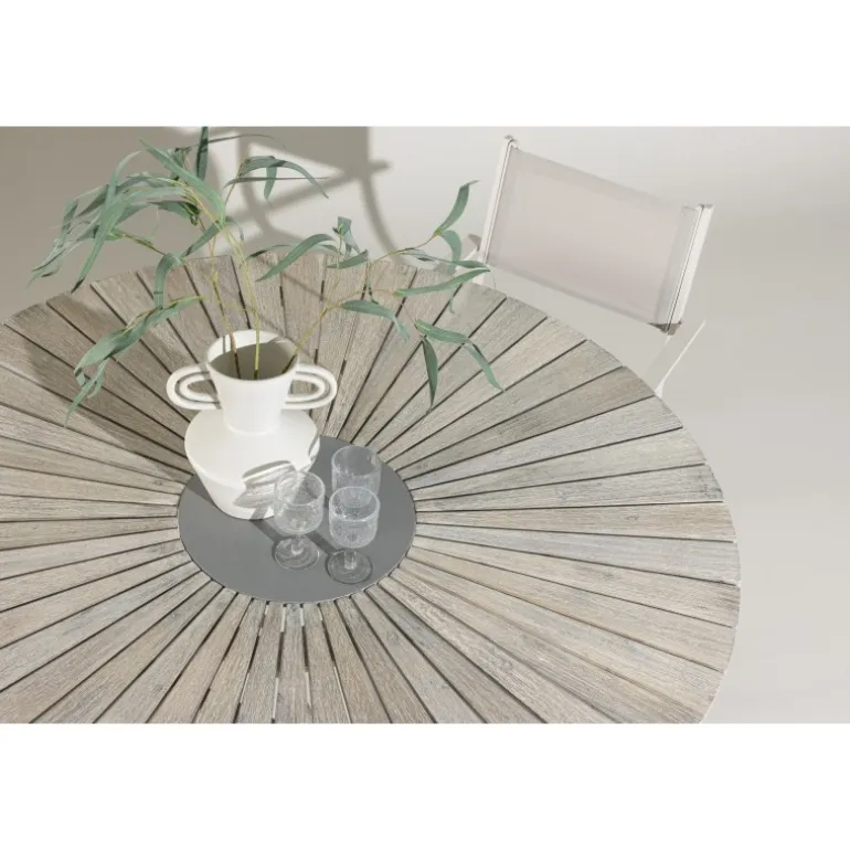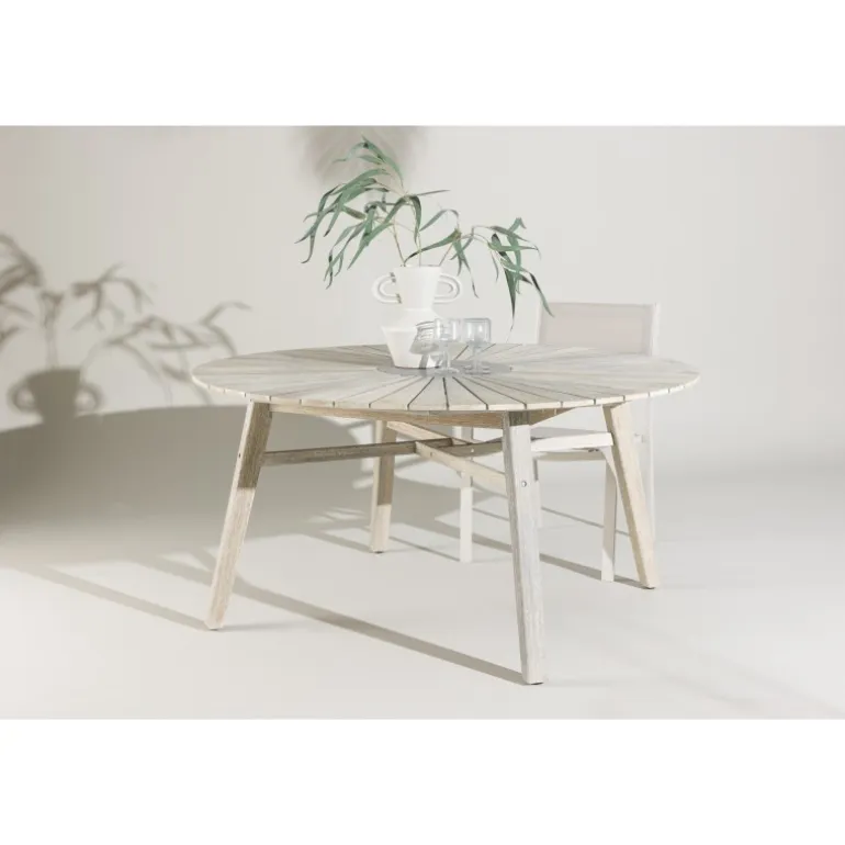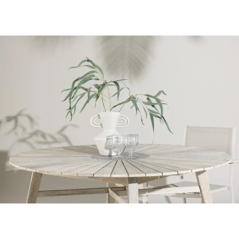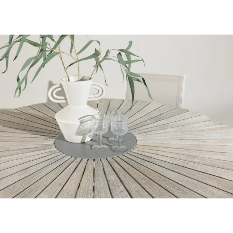 Skab et charmerende midtpunkt med en vidunderlig sommerfølelse og saml familien omkring Rives Bord! Rives er et rundt spisebord i smukt, lysmalet akacie og har en stenplade i midten af bordet: lige så iøjnefaldende som praktisk, da ingen ender ved kanten. Følg vores vedligeholdelsesråd for bedst holdbarhed, og du vil få et spisebord, der er lige så godt i udendørsarealet som på balkonen! Vedligeholdelsesråd: For at holde akaciemøbler i god stand, tør dem af for regn og tør eventuelt spildt væske op. Vi anbefaler at bruge møbelbeskyttelse, når møblerne ikke er i brug, da træet kan revne af fugt. Akaciemøbler, der er tæt på en pool eller et boblebad, bør skylles en gang om ugen, da klor fra behandlet poolvand over tid kan beskadige akaciens beskyttende overflade.
