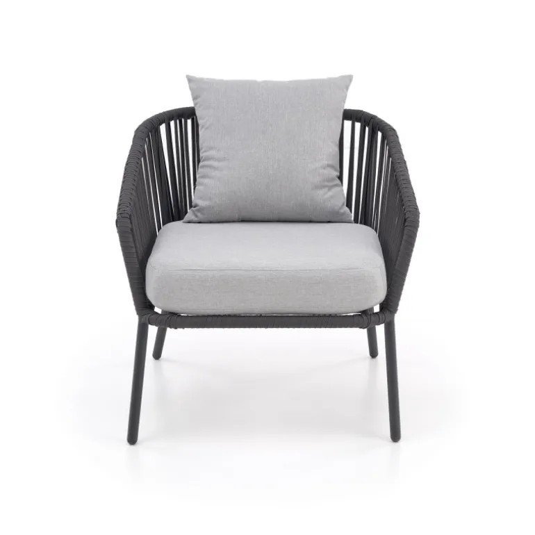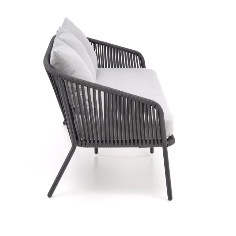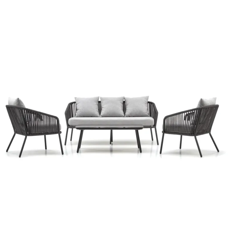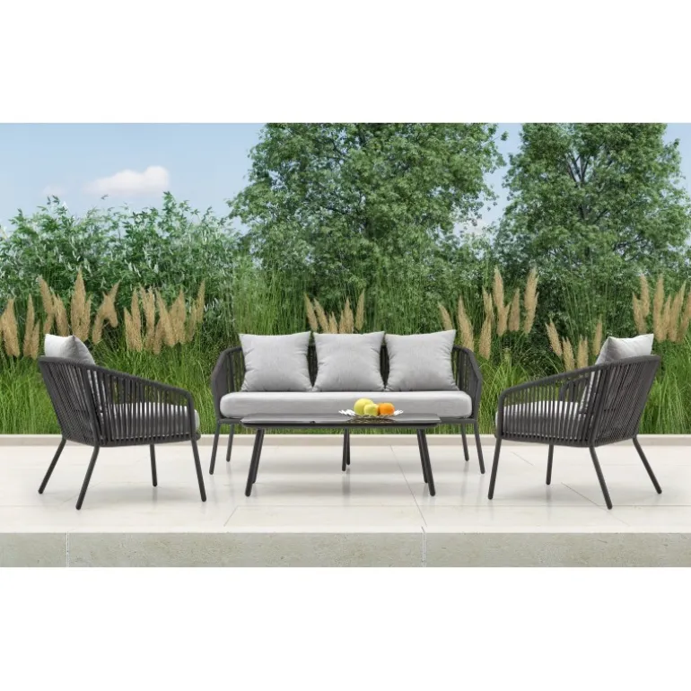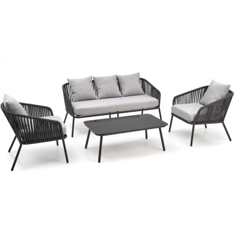 Oplev den perfekte kombination af stil og komfort med ROCCA havesæt. Dette elegante sæt inkluderer en sofa, to stole og et kaffebord, der er ideelt til afslapning i haven eller på terrassen. Fremstillet af holdbare materialer som pulverlakeret aluminium, glas, reb og stof, garanterer dette havesæt langvarig kvalitet og modstandsdygtighed mod vejrets påvirkninger. Den moderne mørkegrå og lysegrå farvepalet passer perfekt til enhver udendørs indretning.