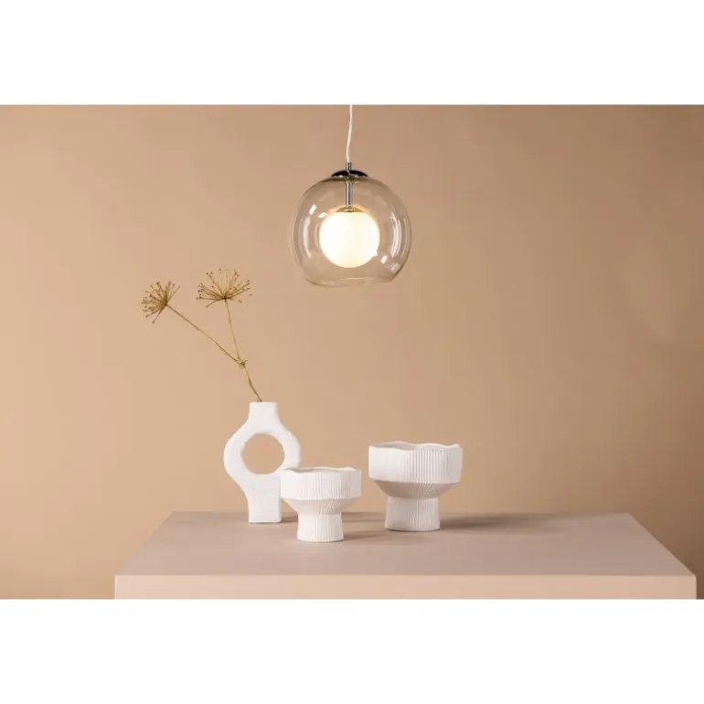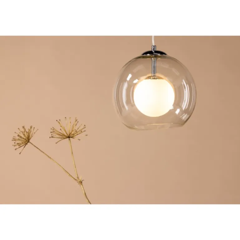 Med Roche loftlampe får du en elegant og stilfuld lampe til at hænge over spisebordet, sofabordet eller i soveværelset. Lampen har en smuk beslag i sølvfarvet jern og en rund lampeskærm i gennemsigtigt glas, der giver et smukt lys. Med sit enkle design passer denne lampe i de fleste rum og indretningsstile og er ikke en lampe, du bliver træt af med det samme.