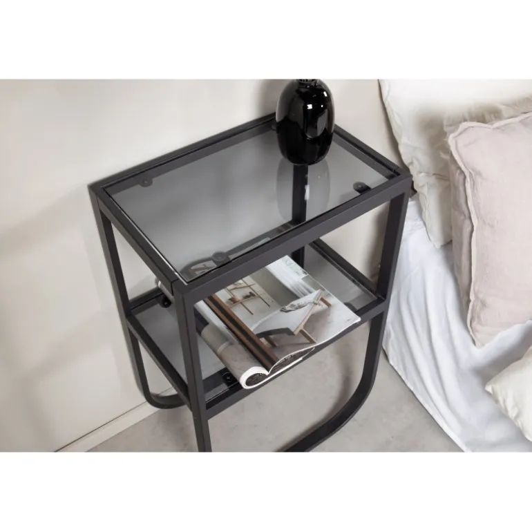 Giv dit soveværelse et moderne præg med Rocker Natbord i sort og gråt røgfarvet glas. Dette elegante natbord kombinerer glas og stål for et stilfuldt og funktionelt design. Perfekt til opbevaring af dine natlige nødvendigheder. Dette bord kræver montering.