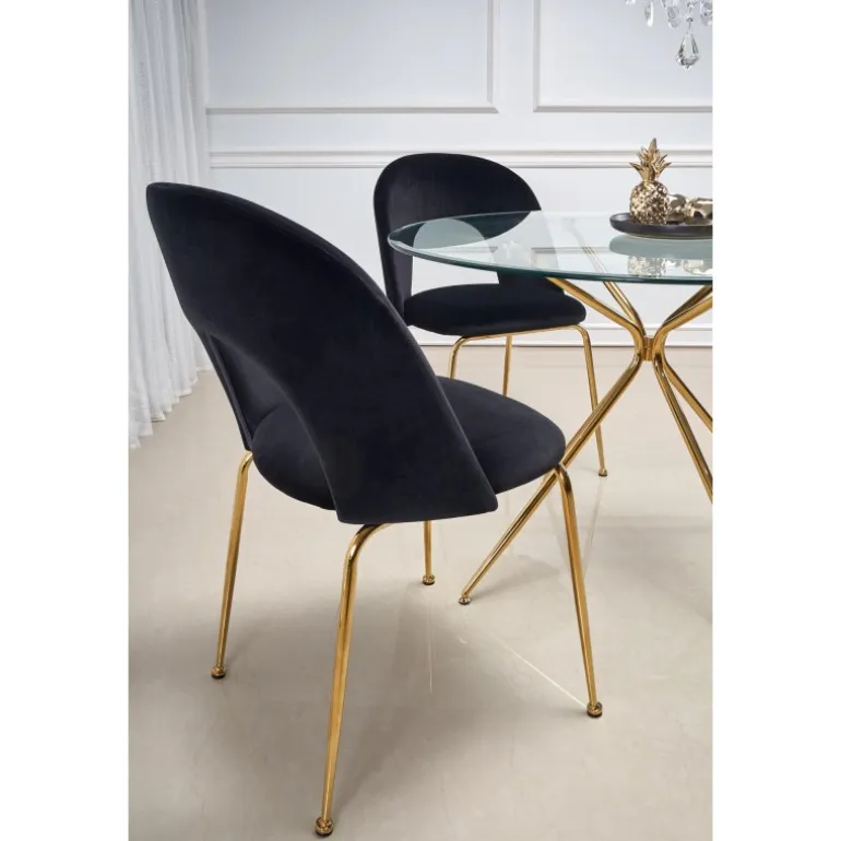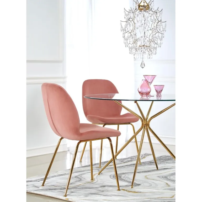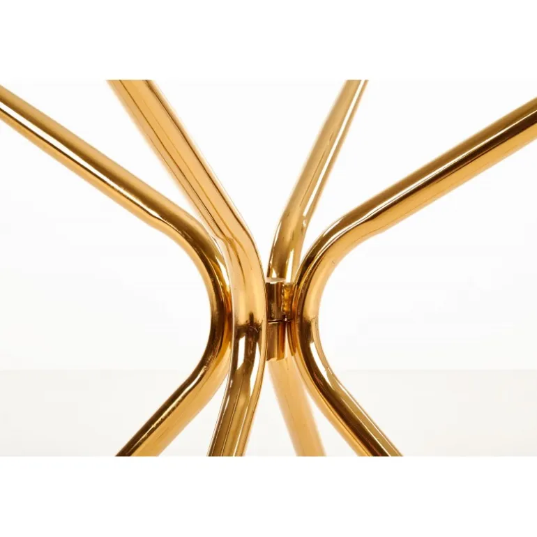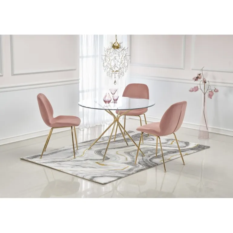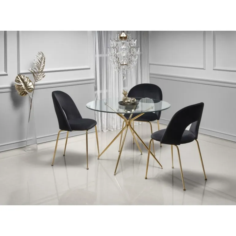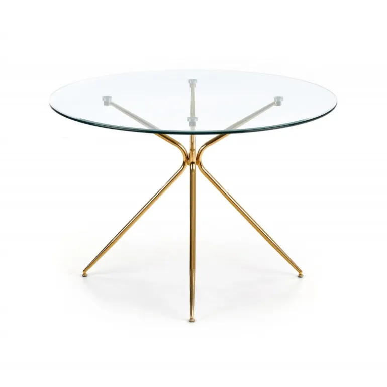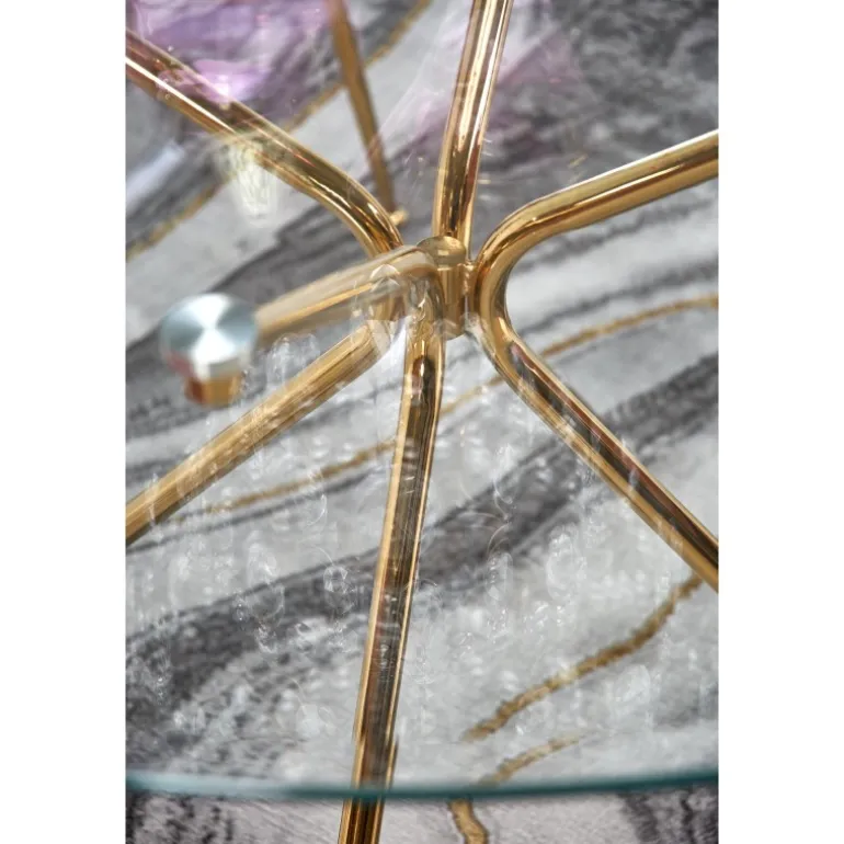 - Elegant design: Transparent glasplade med gyldne ben i kromstål.