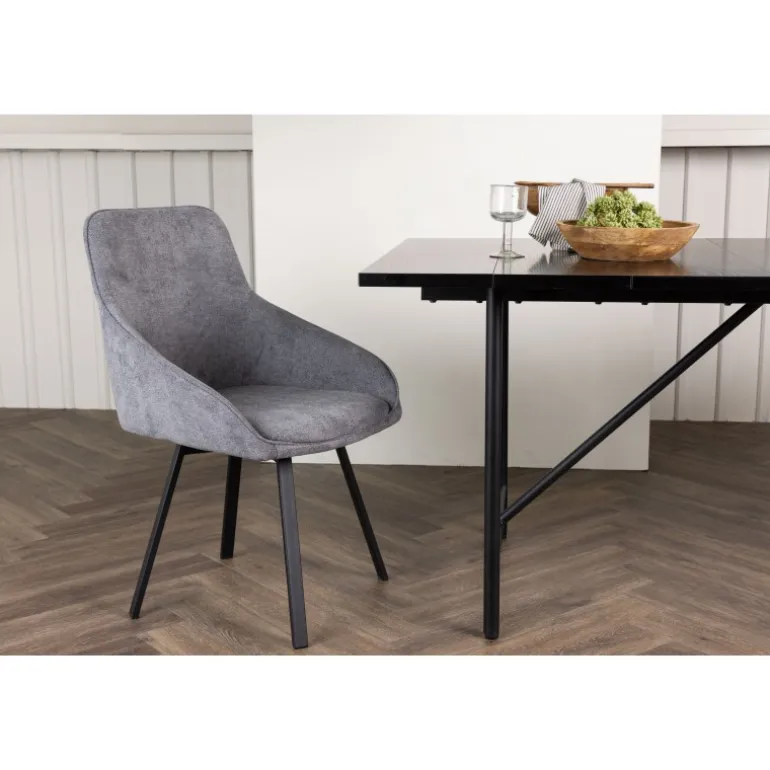 Det skal føles dejligt at samles omkring spisebordet – indret dit hjem med trendsikre spisebordsstole fra Rosie-serien! Denne lækre stol i skandinavisk design har et fuldt polstret sæde med integrerede armlæn i gråt stof og let udfladede stoleben i sort metal. Det bløde sæde er polstret for ekstra komfort og inviterer til lange hyggelige middagsstunder. Match med et flot spisebord, så du får en komplet spisestuegruppe til hjemmets hjerte!