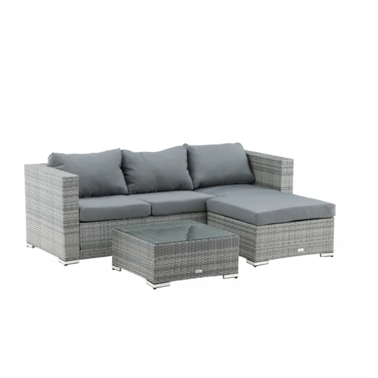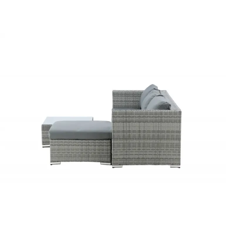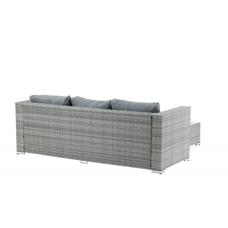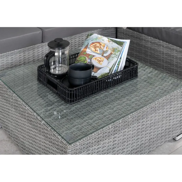 - Komfort: Inkluderer komfortable grå hynder, perfekt til lange samtaler udendørs.