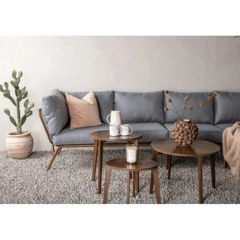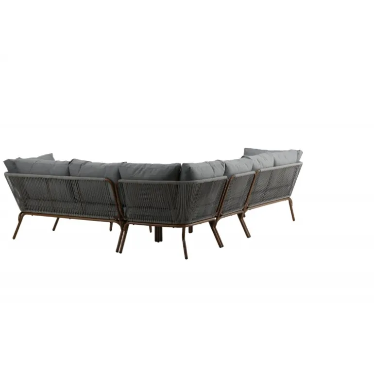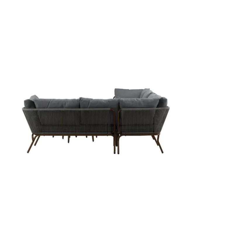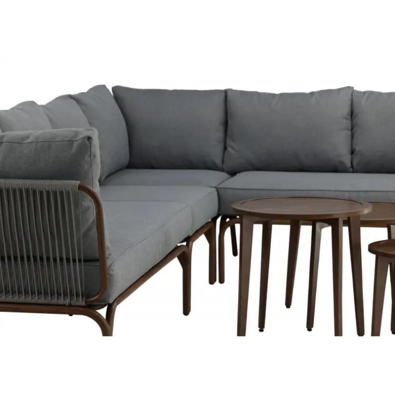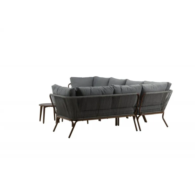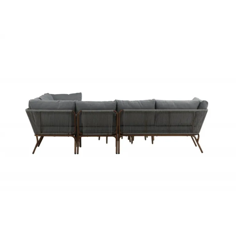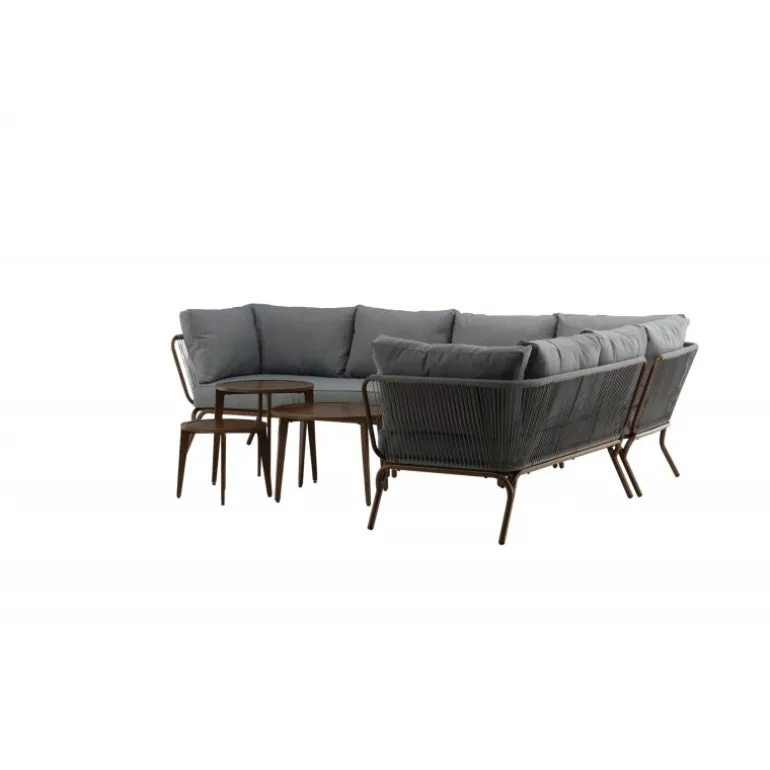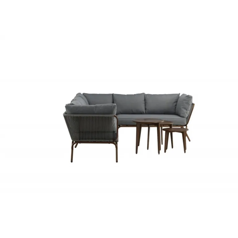 Skab et hyggeligt sted at samle dine kære denne sommer – her sidder du afslappet og komfortabelt i timevis! Roxo er en trendy sofagruppe i stilfuldt design, der er perfekt til terrassen eller udendørsområdet. Sofagruppen består af en hjørnesofa med 5 sæder og en hjørnedel, lavet af et holdbart design i brun pulverlakeret metal med en ryg designet i lysegråt reb og stilfuldt batchbord i tre dele i brunlakeret træ. Grå bløde puder er inkluderet til sofagruppen! Plejeråd: Udendørsmøbler i aluminium og rustfrit stål skal rengøres regelmæssigt med vand og mild sæbe. Skyl altid grundigt med rigeligt vand, hvilket bliver ekstra vigtigt, hvis møblerne er placeret tæt på havet, hvor salt kan transporteres gennem luften.