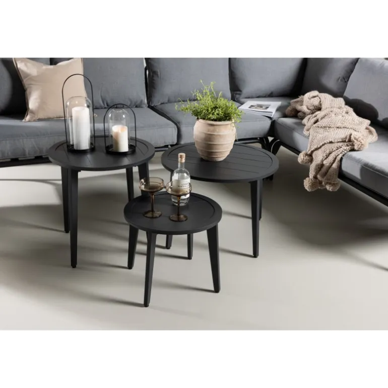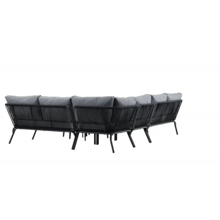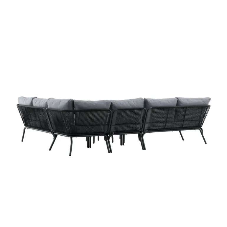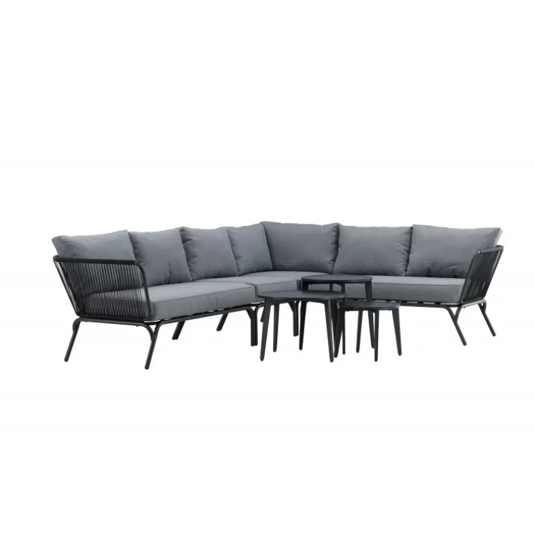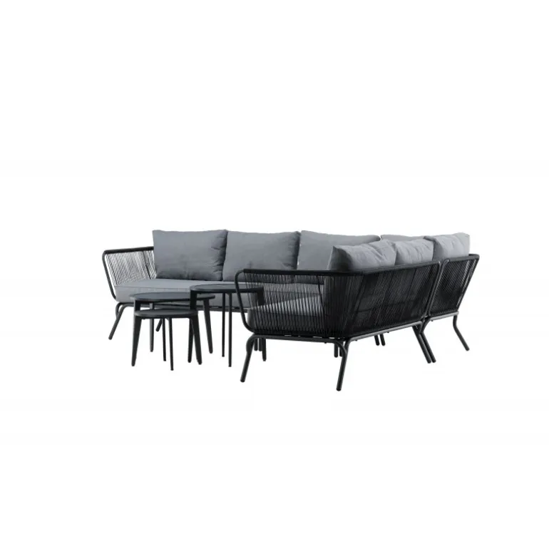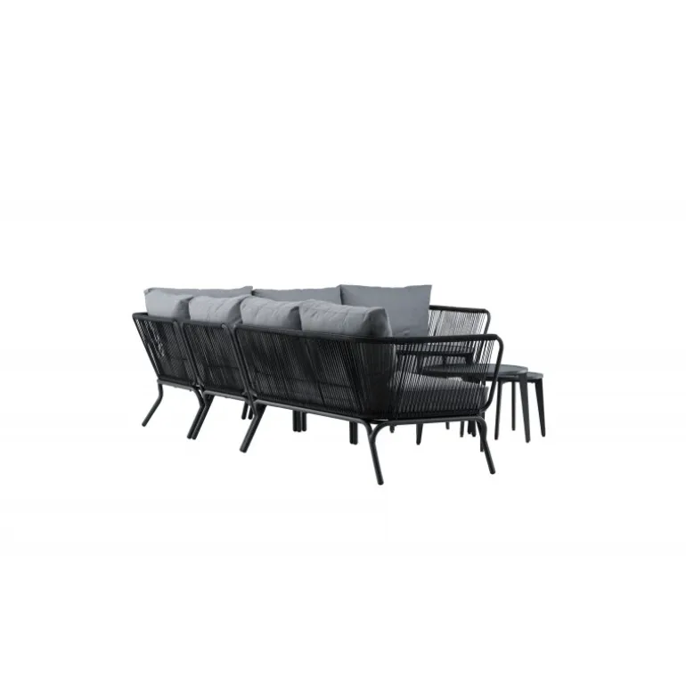Skab et hyggeligt sted at samle dine kære denne sommer – her sidder du afslappet og komfortabelt i timevis! Roxo er en trendy sofagruppe i stilfuldt design, perfekt til terrassen eller udendørsområdet. Sofagruppen består af en hjørnesofa med 6 siddepladser og en hjørnedel, fremstillet i holdbart sort aluminium med ryglæn i sort reb og stilfulde sæt borde i tre dele med bordplader i sort aluminium. Grå bløde puder medfølger til sofagruppen. Mål for borde: 50/36/43×50/42/60 cm. Mål for sofa: 63x63x70 cm. Siddemål: 255x64x29,5 cm. Plejeanvisning: Udendørsmøbler i aluminium og rustfrit stål bør rengøres regelmæssigt med vand og mild sæbe. Skyl altid grundigt med rigeligt vand, hvilket bliver ekstra vigtigt, hvis møblerne er placeret tæt på havet, hvor salt kan blive transporteret gennem luften.