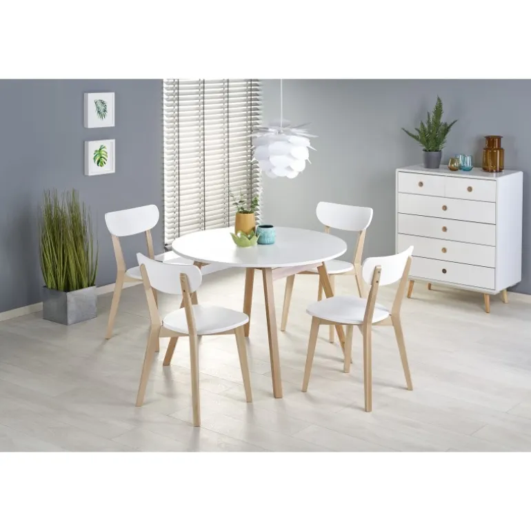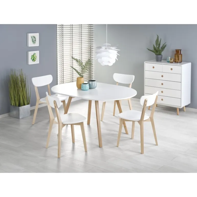Oplev RUBEN forlængelsesbord – det ideelle valg til både små og store hjem. Dette elegante bord er designet med praktisk funktionalitet og stil i tankerne. Med dimensioner på 102-142/102/73 cm kan bordet nemt forlænges, så du kan have plads til flere gæster. Bordpladen er lavet af lamineret MDF, mens benene er af massivt bøgetræ, hvilket giver bordet en robust og holdbar konstruktion. Den hvide top og de honningfarvede ben tilføjer et moderne touch til enhver spisestue.