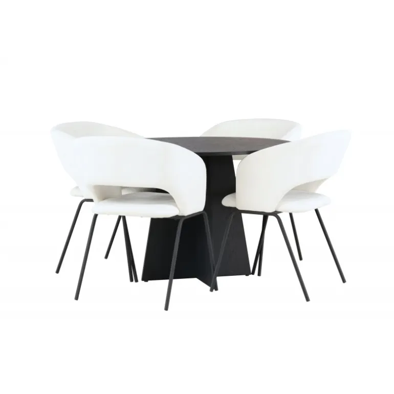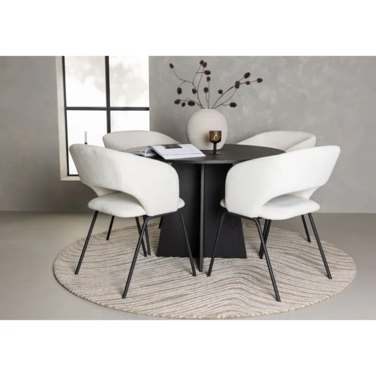 Skab en moderne atmosfære i dit hjem med et rundt Spisebordssæt! Velkommen hjem til en hyggelig og indbydende følelse. Vores runde spisebord, Bootcut, er stilfuldt designet med en sort MDF finerbordplade og en robust ramme af samme materiale. Bordets smarte størrelse gør det til et ideelt sted for måltider og sociale sammenkomster, hvor ingen ender på kanten. Bordets diameter: 110cm. Her er Bootcut-bordet kombineret med vores vidunderlige stole fra Day-serien. Day-stolene kombinerer gennemtænkt design, bløde former og en minimalistisk struktur for at skabe en perfekt siddeoplevelse. Med fuldt polstrede sæder og en åben rygstøtte tilbyder Day-stolene exceptionel komfort, samtidig med at de udstråler en moderne og luksuriøs stil. Day-stolene er polstret i elegant hvidt linnedstof, og de slanke stoleben i sort stål skaber en elegant kontrast, der fremhæver stolens strømlinede udseende. Med disse stole vil du hæve stilniveauet i dit hjem og skabe en indbydende atmosfære, der imponerer både familie og venner. Her får du virkelig en perfekt kombination af stil og komfort!