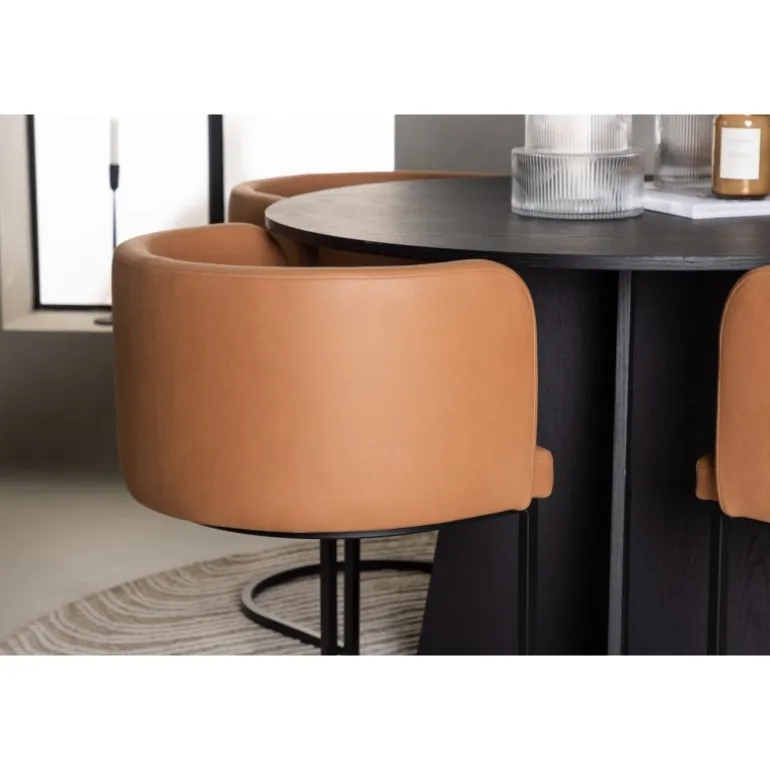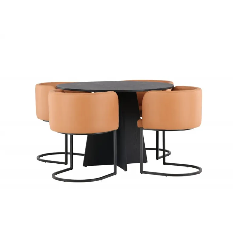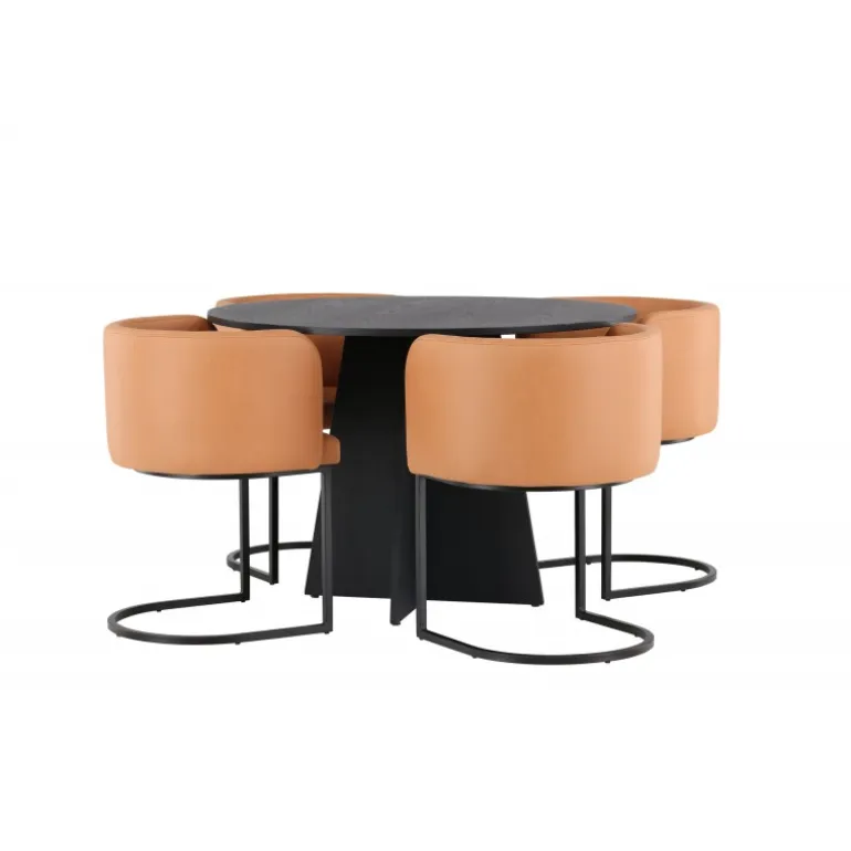 Kan det blive mere stilfuldt end dette? Dette Spisebordssæt i rustik og moderne stil imponerer med sit gennemtænkte design og høje komfort! Vores runde spisebord, Bootcut, bliver hjertet i dit hjem. Med sin runde sorte MDF finer bordplade udstråler det en følelse af selvtillid og sofistikation. Bordets designrige base er en fryd for øjet og tilføjer et elegant touch til helhedsindtrykket. Sammen med de brune stole fra Simrishamn-serien bliver din spiseoplevelse komplet. Disse stole er ikke kun stilfulde, men også utroligt komfortable. Med deres fuldt polstrede sæder og runde brune TC stofryglæn tilbyder de den perfekte kombination af komfort og elegance. De minimalistiske sorte stålben tilføjer et moderne og slankt touch til din spisestue. Her får du ikke blot et Spisebordssæt, men også en festlig atmosfære i din stue. Her kan du og din familie nyde god mad og godt selskab!