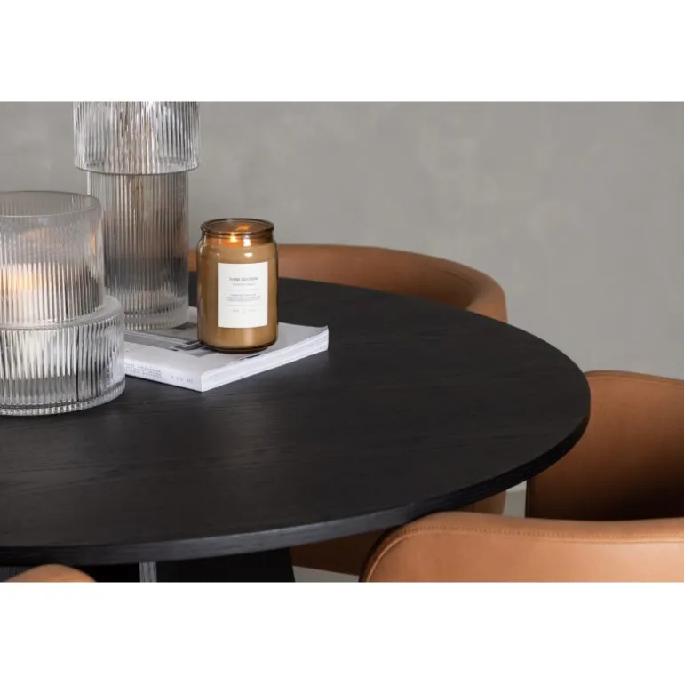 - Rund bordplade: Sort MDF finer, der udstråler selvtillid og sofistikation.