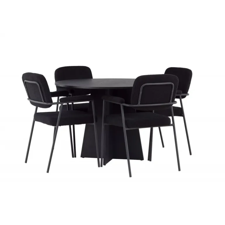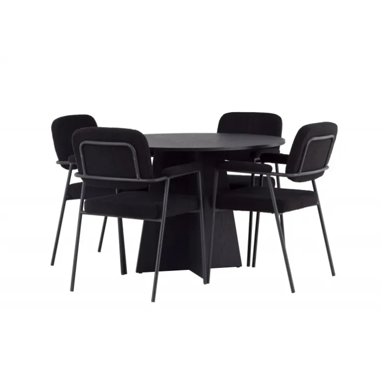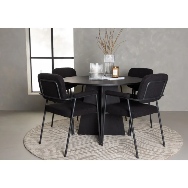Et Spisebordssæt i en røget sort nuance, der udstråler charme, modernitet og tidløshed – hvad mere kan man ønske sig? Vores sorte spisebord, Bootcut, har en charmerende rund bordplade lavet af finer-MDF og en gennemtænkt designæstetik, der vil løfte dit interiør. Den designrige base tilføjer en fin detalje og giver bordet et solidt fundament. Bordets dimensioner: 110 cm. For at fuldende Spisebordssættet har vi parret det med vores sorte, skandinavisk-inspirerede spisestole fra Yesterday-serien. Disse trendy stole vil gøre dit hjem charmerende og indbydende. Stolen har et fuldt polstret sæde i sort bouclé-stof og slanke stoleben med integrerede sorte metalarmlæn. Det bløde polstrede sæde tilføjer en ekstra dimension af komfort, så du kan nyde lange og hyggelige middage med familie og venner. Dette Spisebordssæt har alt, hvad du kan have brug for, og er lige så egnet til stuen som til det moderne køkken. Sid komfortabelt, nyd dejlige måltider og pryd dit hjem med denne stilfulde centerpiece!