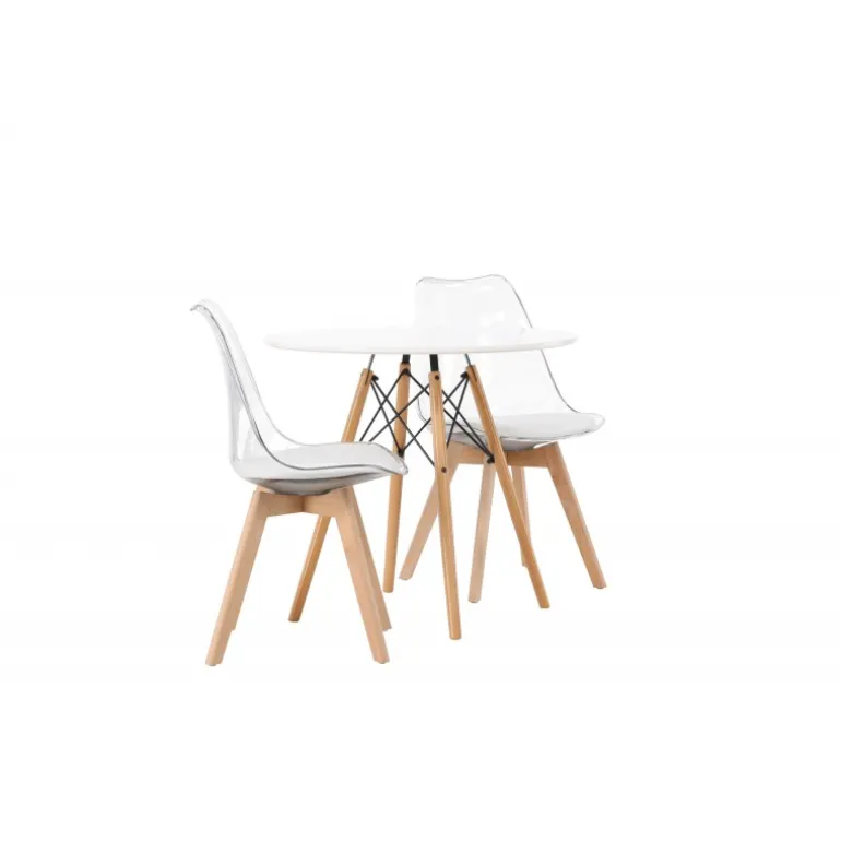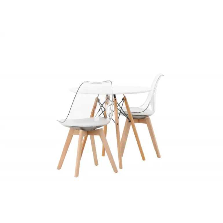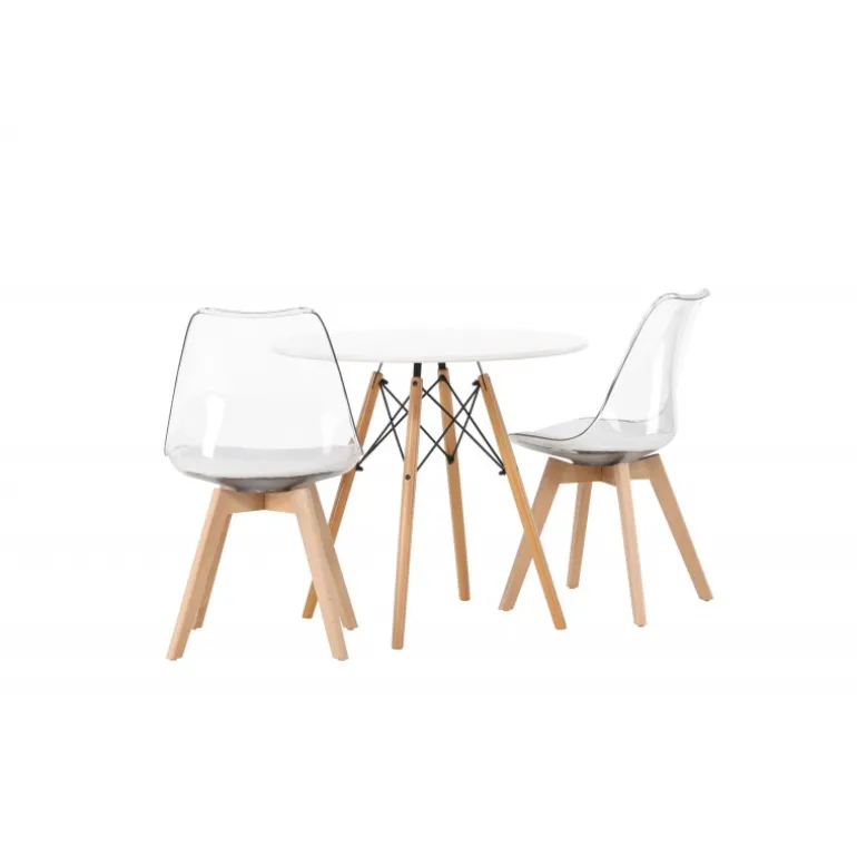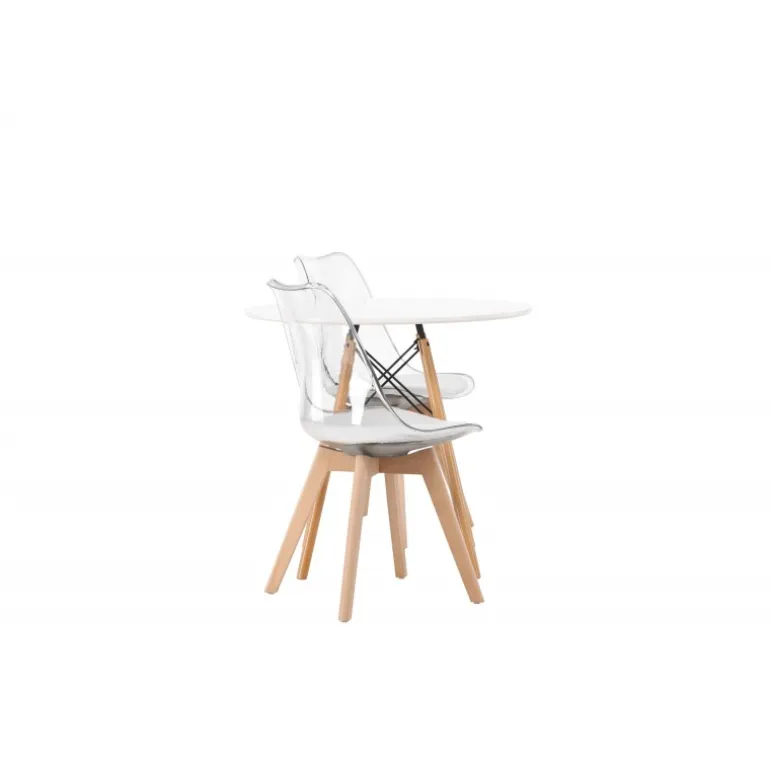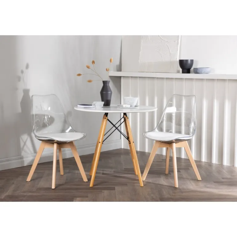 Et modebevidst blikfang! Det runde spisebord Danburi har et klassisk design med en rund bordplade i hvid MDF og let udadgående ben i bøgetræ med dekorative detaljer i sort stål. Her sammen med smarte og trendy spisestuestole fra Edvin-serien. Den gennemsigtige sæde er i PET med en hvid sædehynde for ekstra komfort, og stolebenene er let udadgående i naturligt træ. Her skaber du en personlig og trendy atmosfære! Borddiameter: 60 cm.