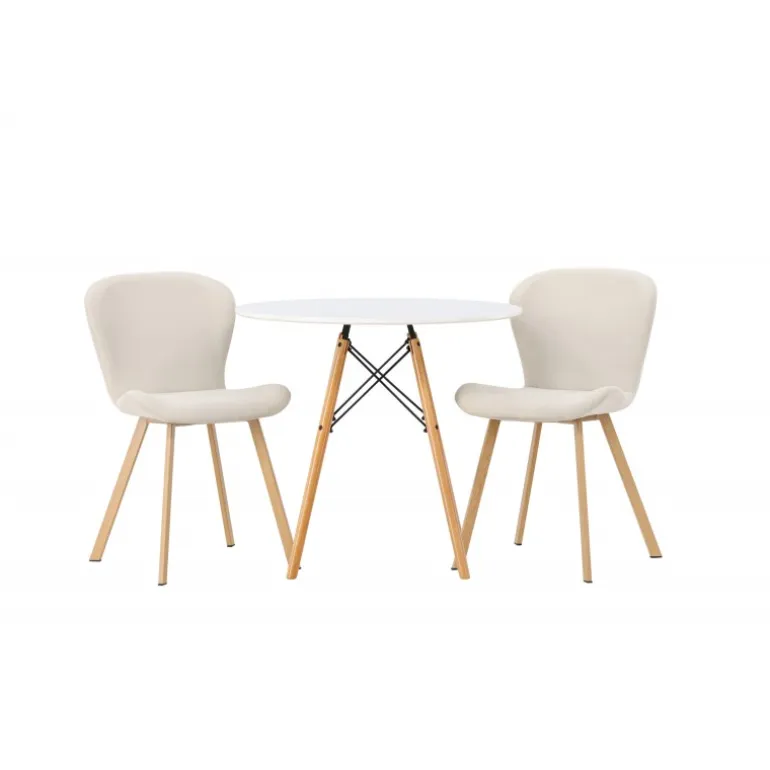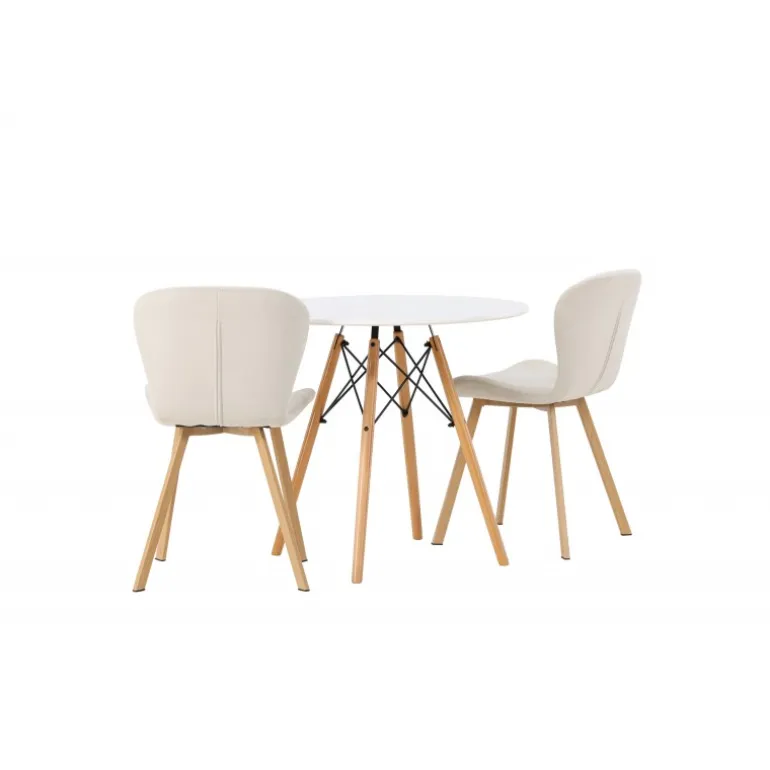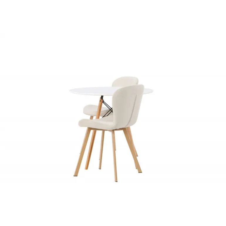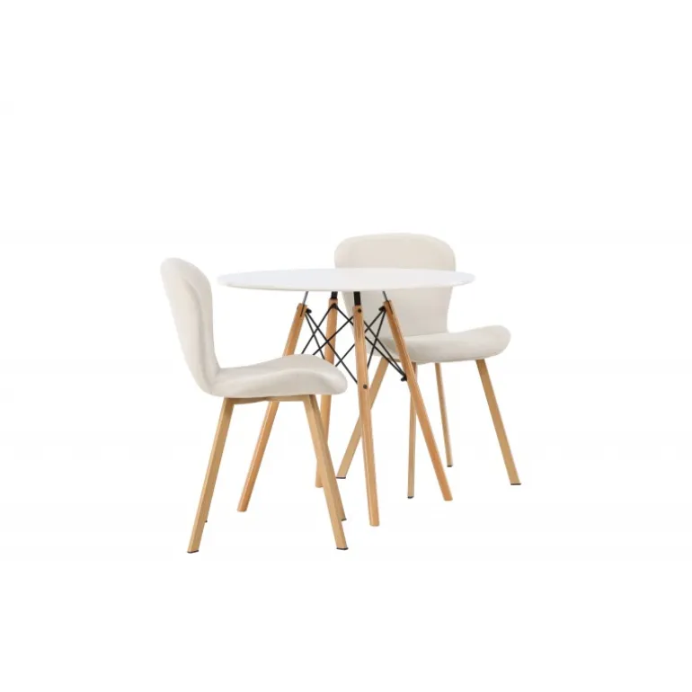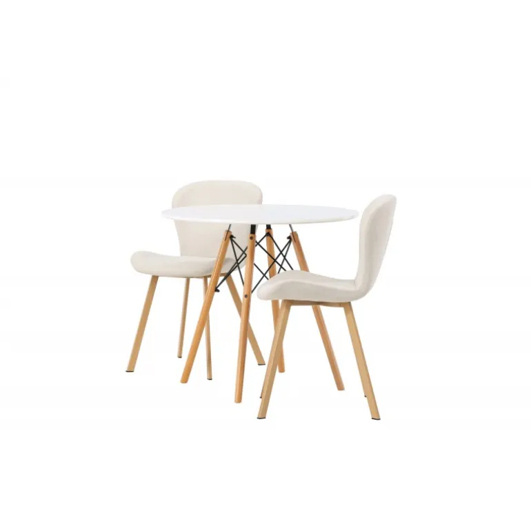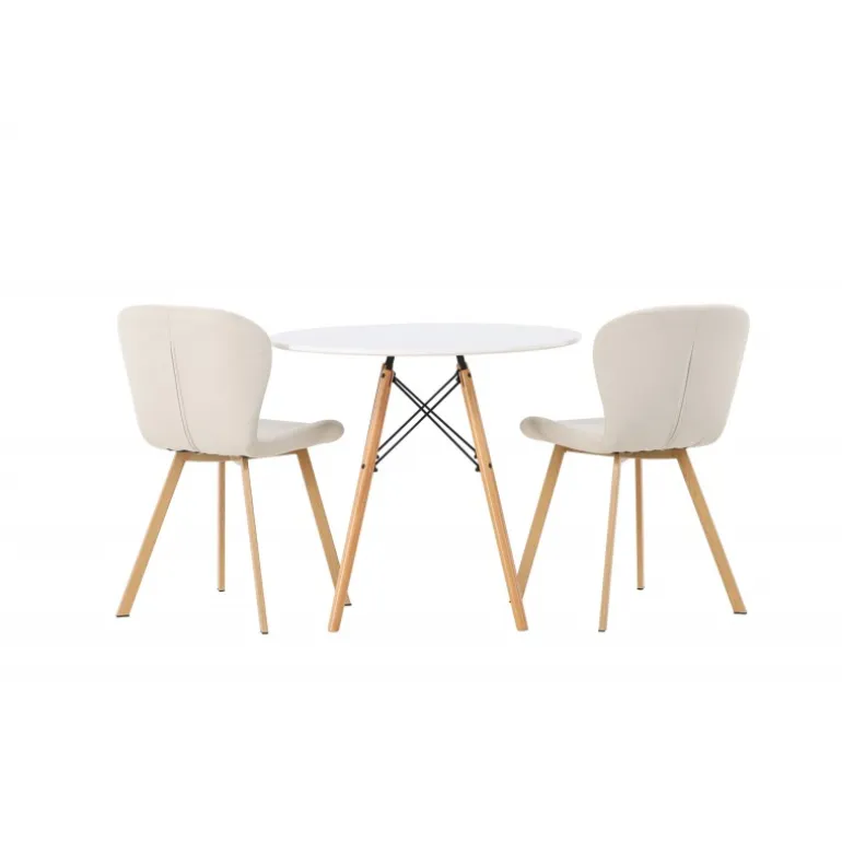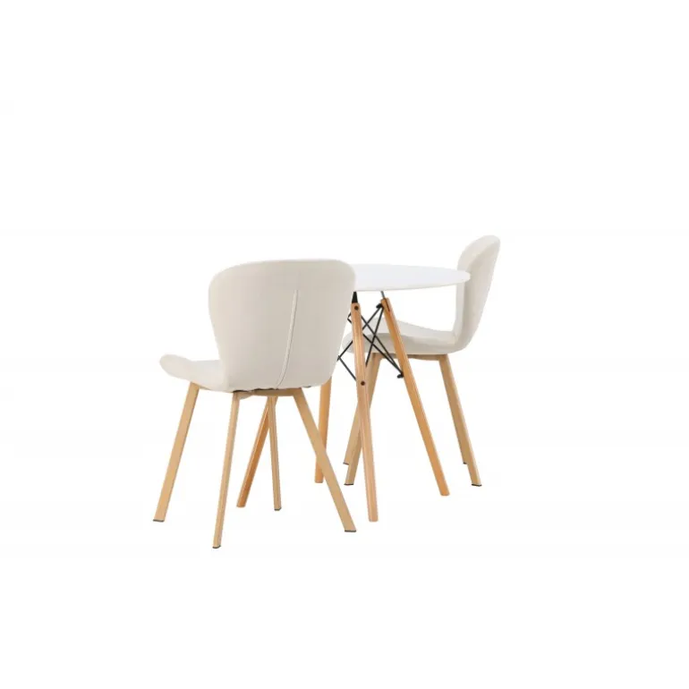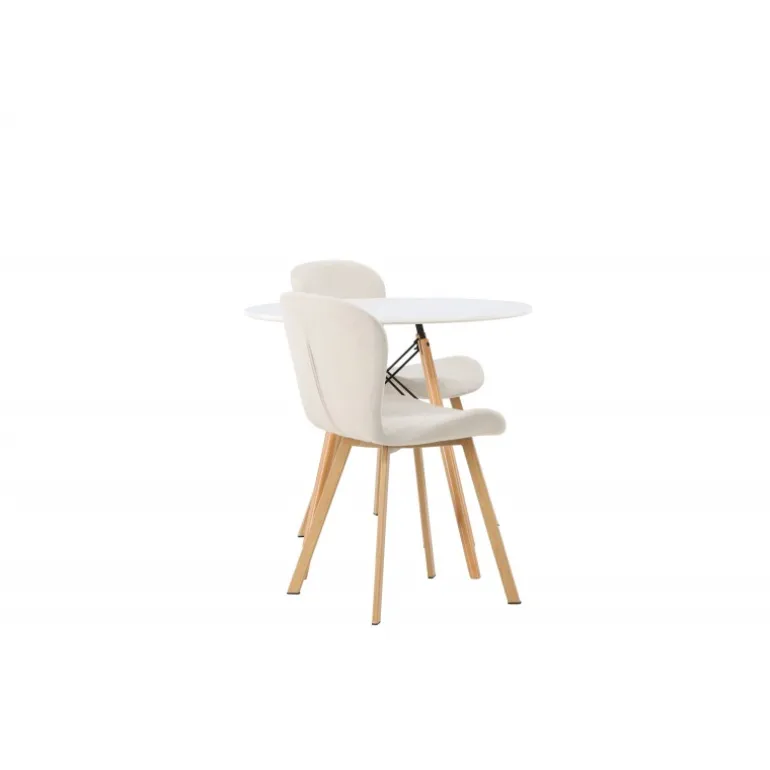 Dette charmerende sæt udstråler luksus! Det runde spisebord Danburi har et klassisk design med en rund bordplade i hvid MDF og let flarede ben i bøgetræ med dekorative detaljer i sort stål. Her i en vidunderlig kombination med beige spisestuestole fra Lilja-serien. Stolen har et smidigt rundt design med et sæde i beige polyesterstof og let flarede ben i sort metal. Sid behageligt uden at gå på kompromis med stilen! Borddiameter: 60cm.