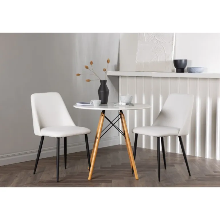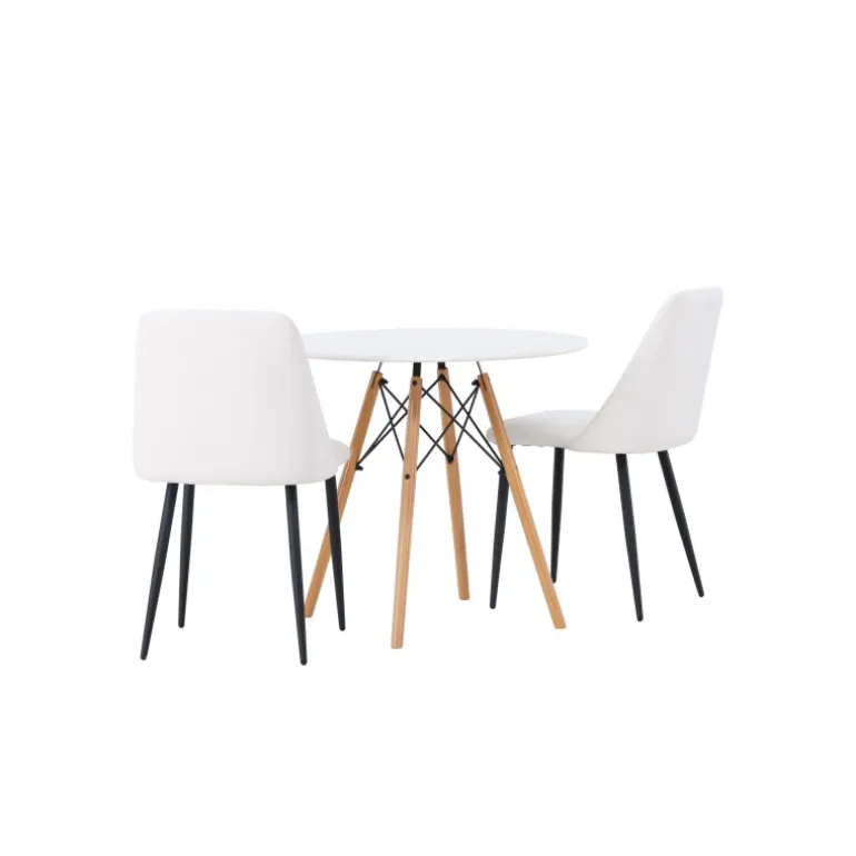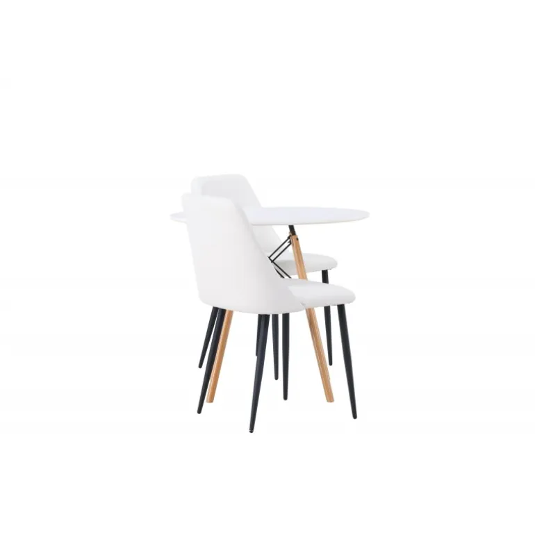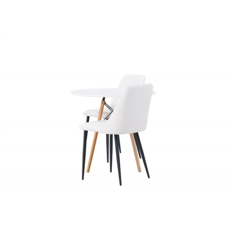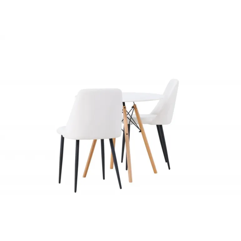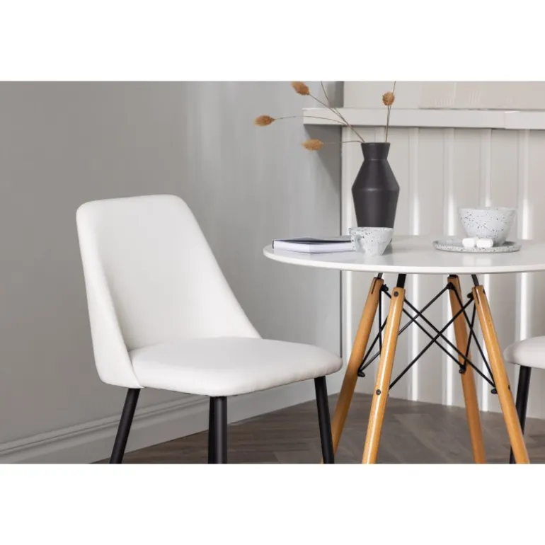 Bløde og indbydende former! Det runde spisebord Danburi har et klassisk design med en rund bordplade i hvid MDF og let skrånende ben i bøgetræ med dekorative detaljer i sort stål. Her i en stilfuld kombination med hvide spisebordsstole fra serien Night. Stolen har en fuldt polstret sæde i hvid PU-betræk, som føles lige så luksuriøs som elegant, og benene er i sort stål. Sædet er også polstret for ekstra komfort. Denne Spisebordssæt udstråler luksus og bekvemmelighed! Bordets diameter: 60 cm.