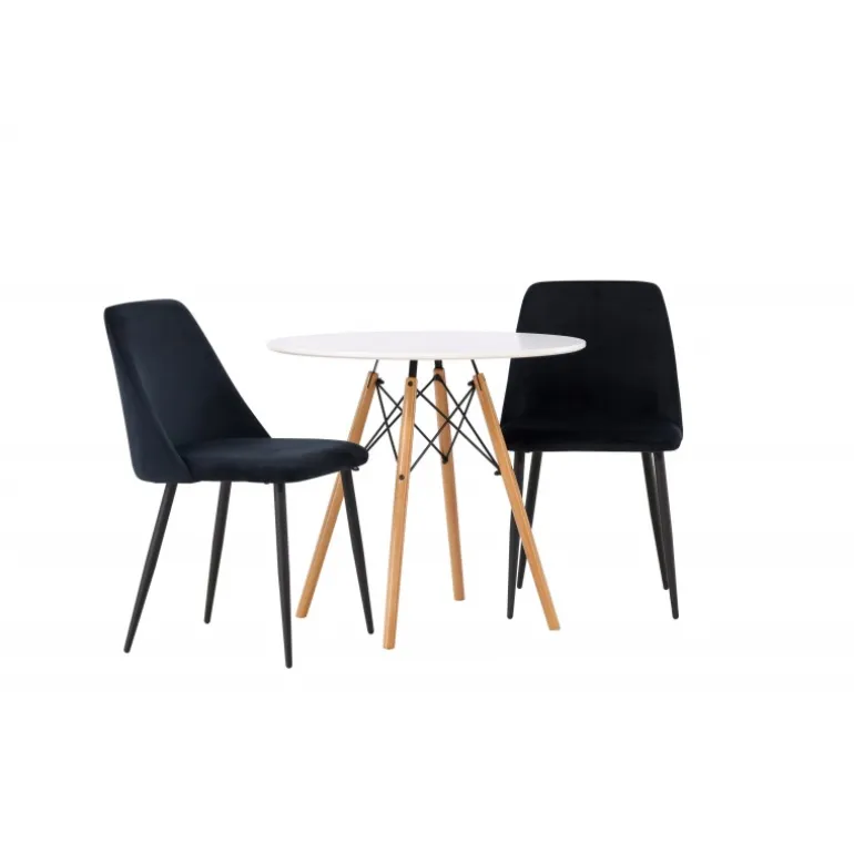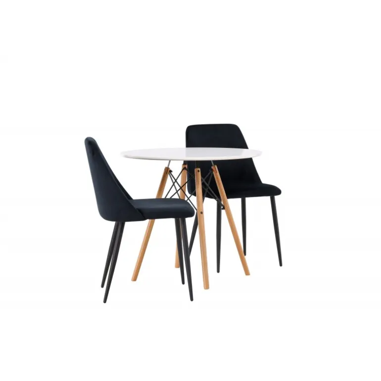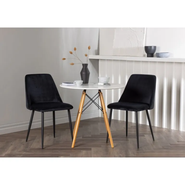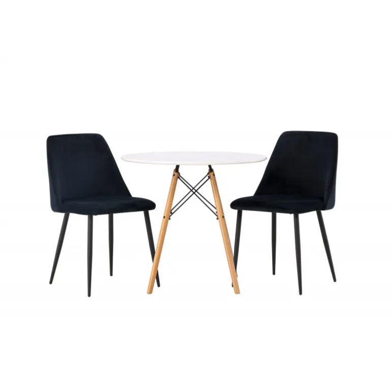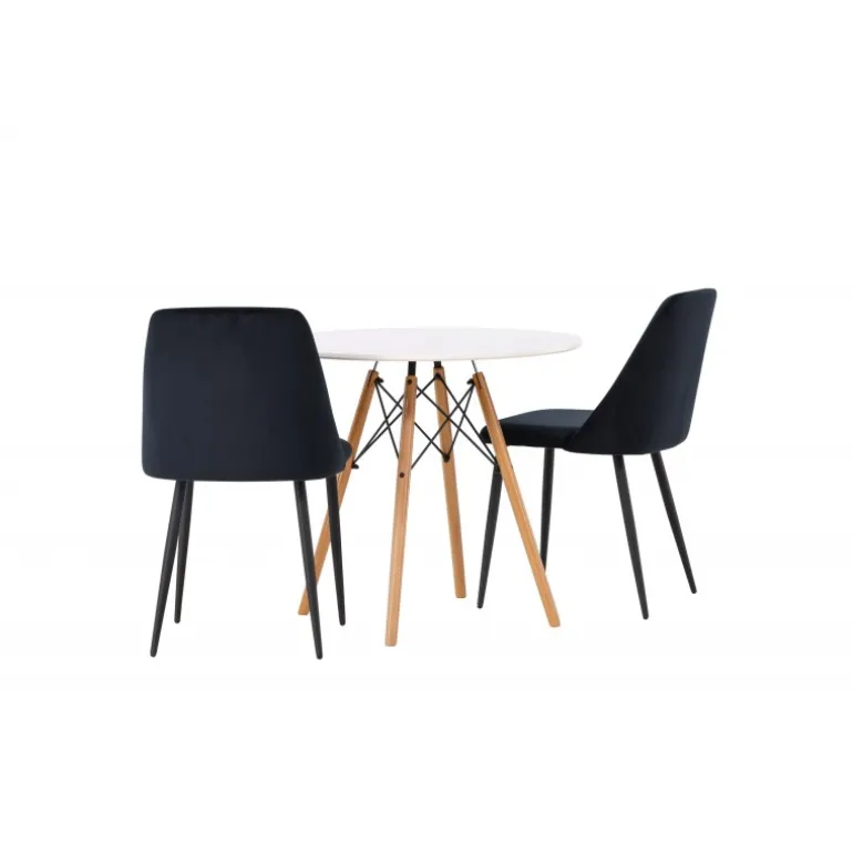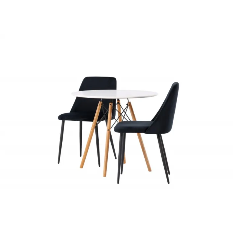Fløjlsblødt og tæt på naturen! Det runde spisebord Danburi har et klassisk design med en rund bordplade i hvid MDF og let udadgående ben i bøgetræ med dekorative detaljer i sort stål. Her i perfekt kombination med sorte spisestole fra serien Night. Stolen har et fuldt polstret sæde i sort fløjlsstof og ben i matchende sort farve. Her får du en Spisebordssæt, der skaber en luksuriøs glans i rummet og bidrager til en indbydende og modebevidst atmosfære! Bordet har en diameter på 60 cm.